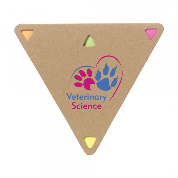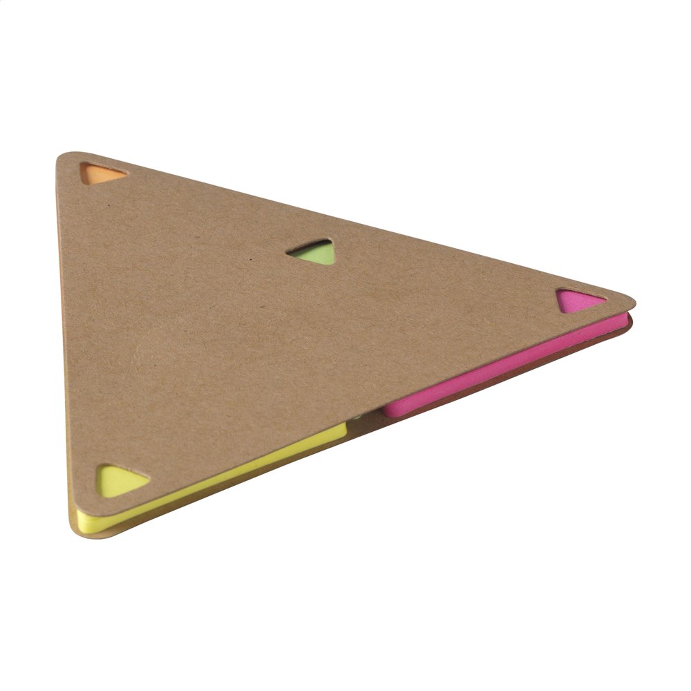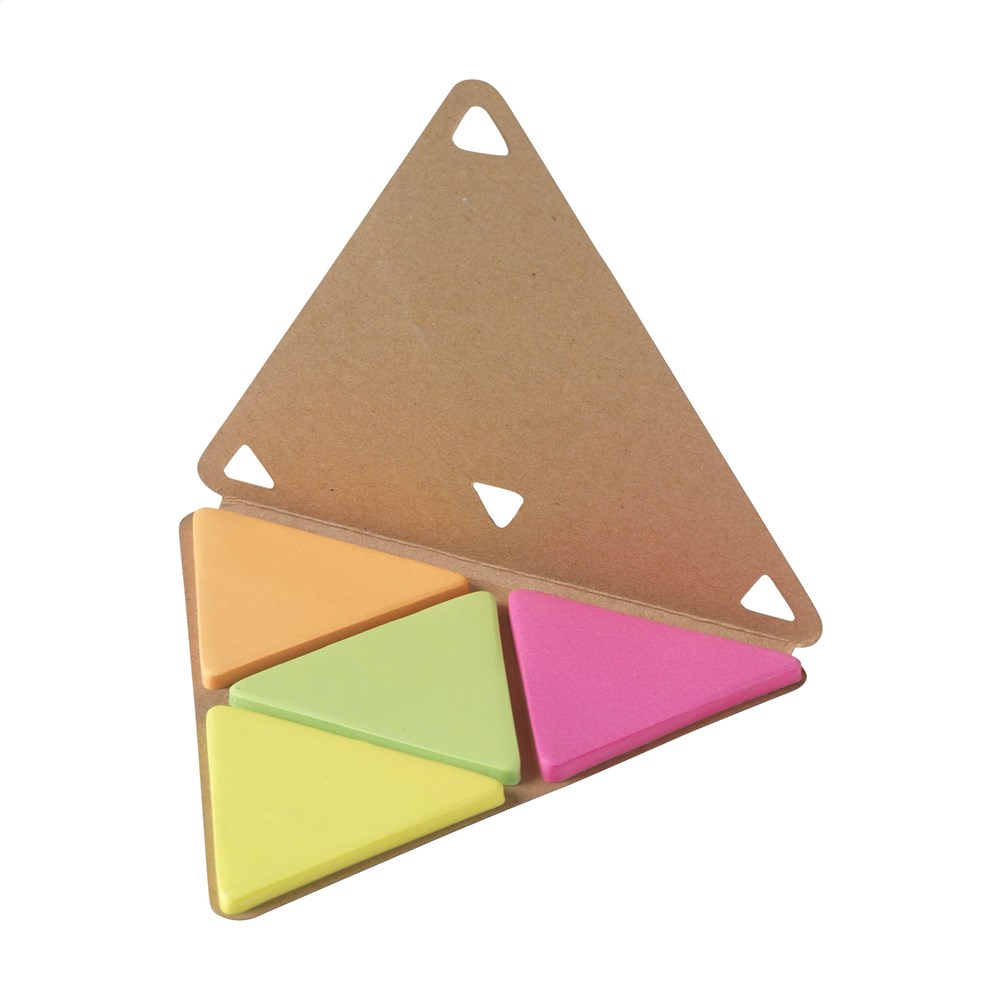 Memoblokje in de vorm van een driehoek, met zelfklevende memovelletjes in 4 kleuren. 25 memovelletjes per kleur.