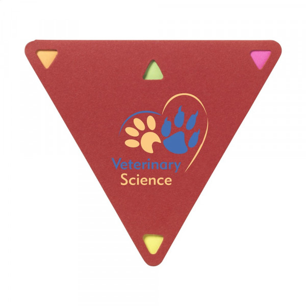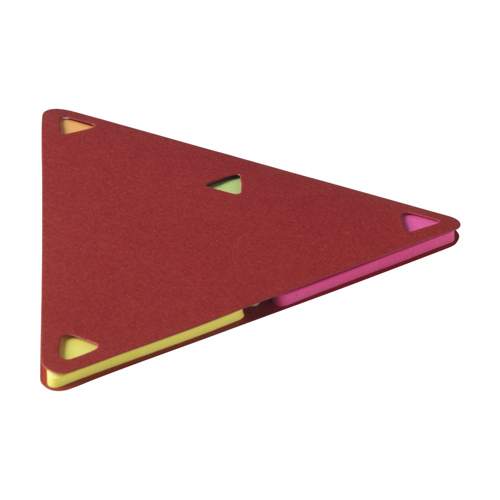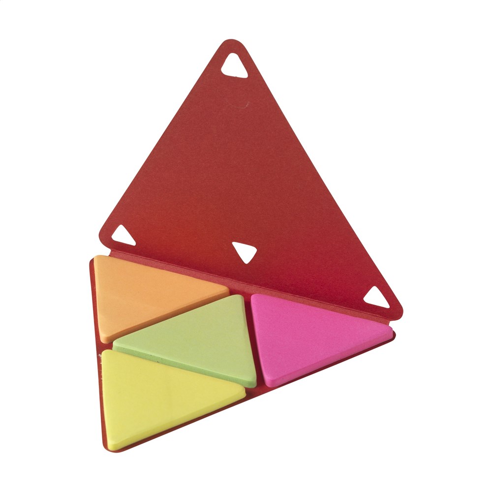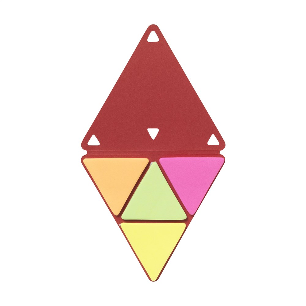 Memoblokje in de vorm van een driehoek, met zelfklevende memovelletjes in 4 kleuren. 25 memovelletjes per kleur.