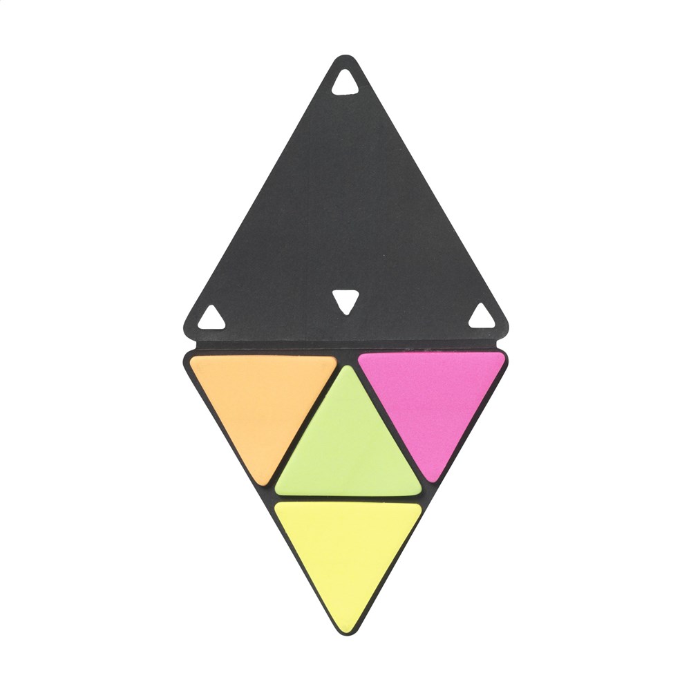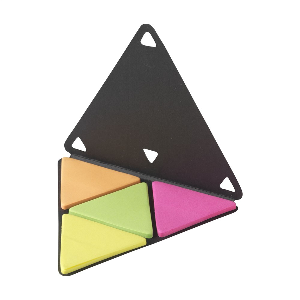 Memoblokje in de vorm van een driehoek, met zelfklevende memovelletjes in 4 kleuren. 25 memovelletjes per kleur.