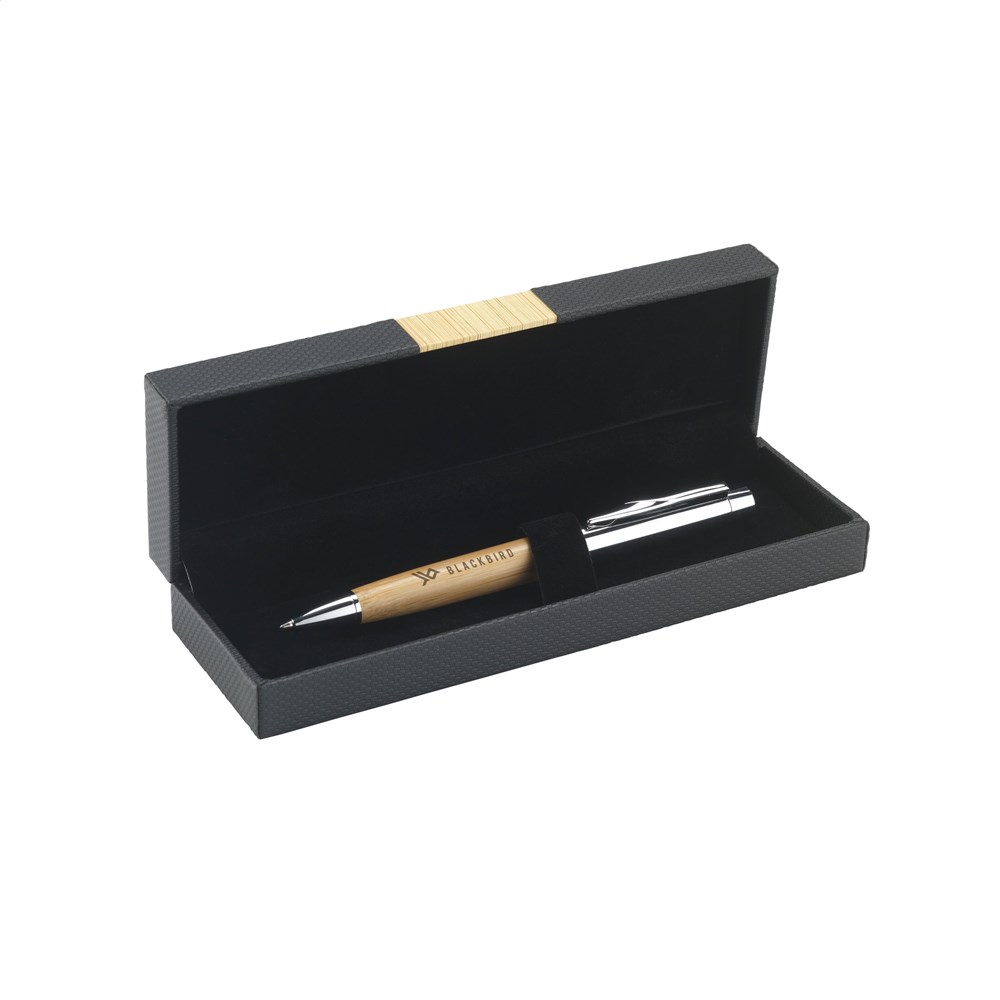 Blauwschrijvende, metalen balpen met een gepolijste, supergladde chroom finish en bamboe voorstuk. De pen heeft een draaikliksysteem. Per stuk in een mooie, bijpassende cassette met bamboe accent. Een opvallend chique set. Per set in doosje.