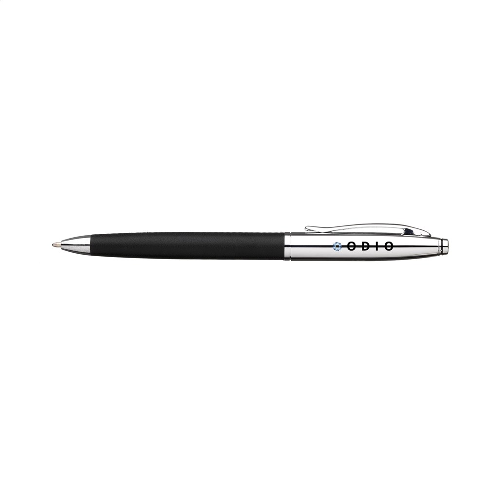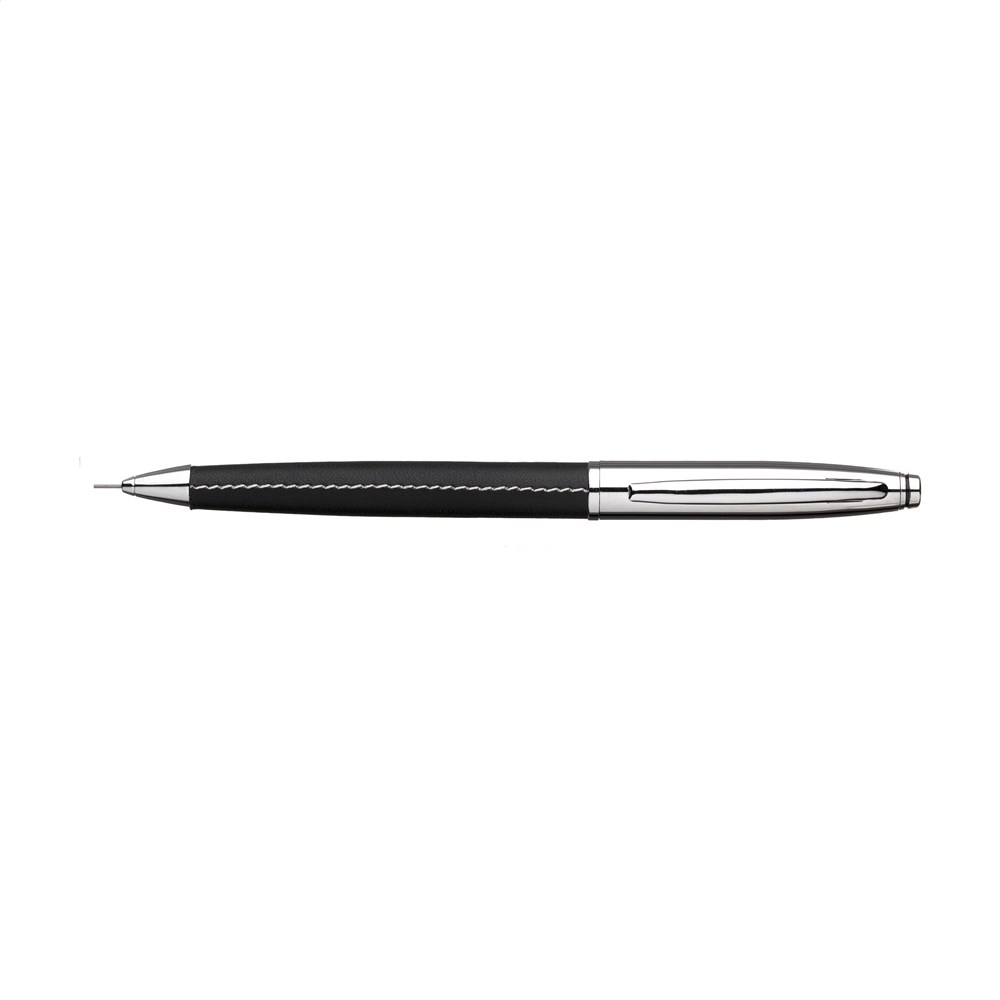 Schrijfset: blauwschrijvende balpen en vulpotlood met 3 HB vulingen (0,7 mm). Beide met imitatieleren voorstuk, draaikliksysteem, metalen clip en puntstuk. Per set in kartonnen geschenkverpakking met fluwelen inlage.