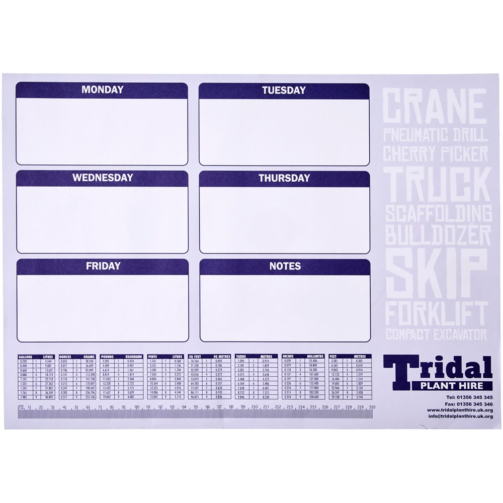 Wit A2 Desk-Mate® bureauonderlegger. Bevat vellen blanco papier van 80 g/m2. Standaard geleverd met 50 vellen, ook verkrijgbaar met 25 of 100 vellen. Decoratie mogelijk op elk blad. Afmetingen blad: 594x420mm.