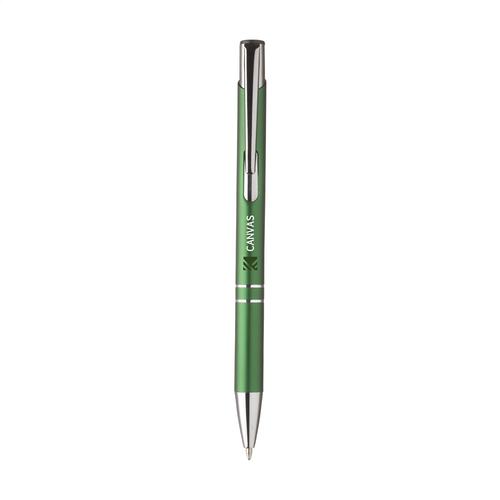 Blauwschrijvende óf zwartschrijvende, aluminium balpen met matgekleurde houder in metallic look en metalen clip. Geef je geschenk meer karakter met één van onze stijlvolle geschenkverpakkingen.