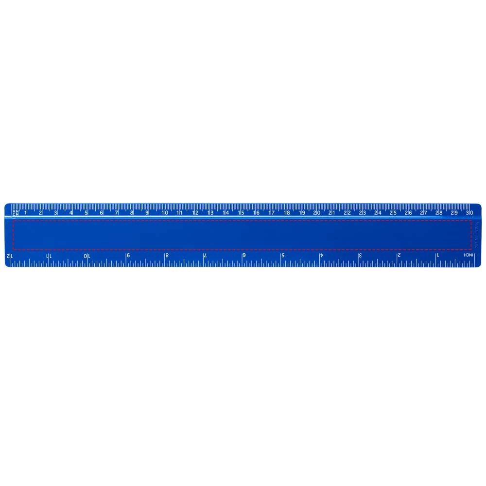 Hard kunststof liniaal met zowel markeringen in inches als centimeters. Let op, de markeringen op de linialen worden samen met het artwork bedrukt, onbewerkte linialen zijn niet voorzien van markeringen.