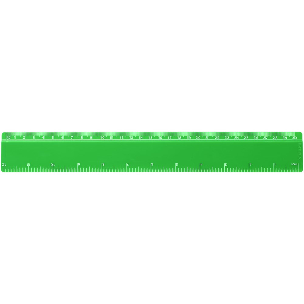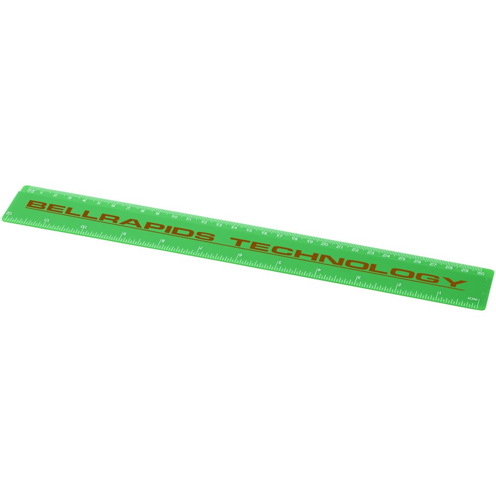 Hard kunststof liniaal met zowel markeringen in inches als centimeters. Let op, de markeringen op de linialen worden samen met het artwork bedrukt, onbewerkte linialen zijn niet voorzien van markeringen.