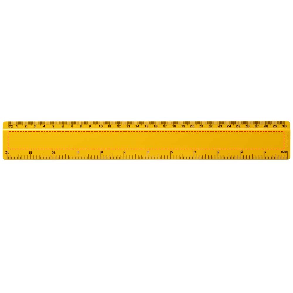Hard kunststof liniaal met zowel markeringen in inches als centimeters. Let op, de markeringen op de linialen worden samen met het artwork bedrukt, onbewerkte linialen zijn niet voorzien van markeringen.