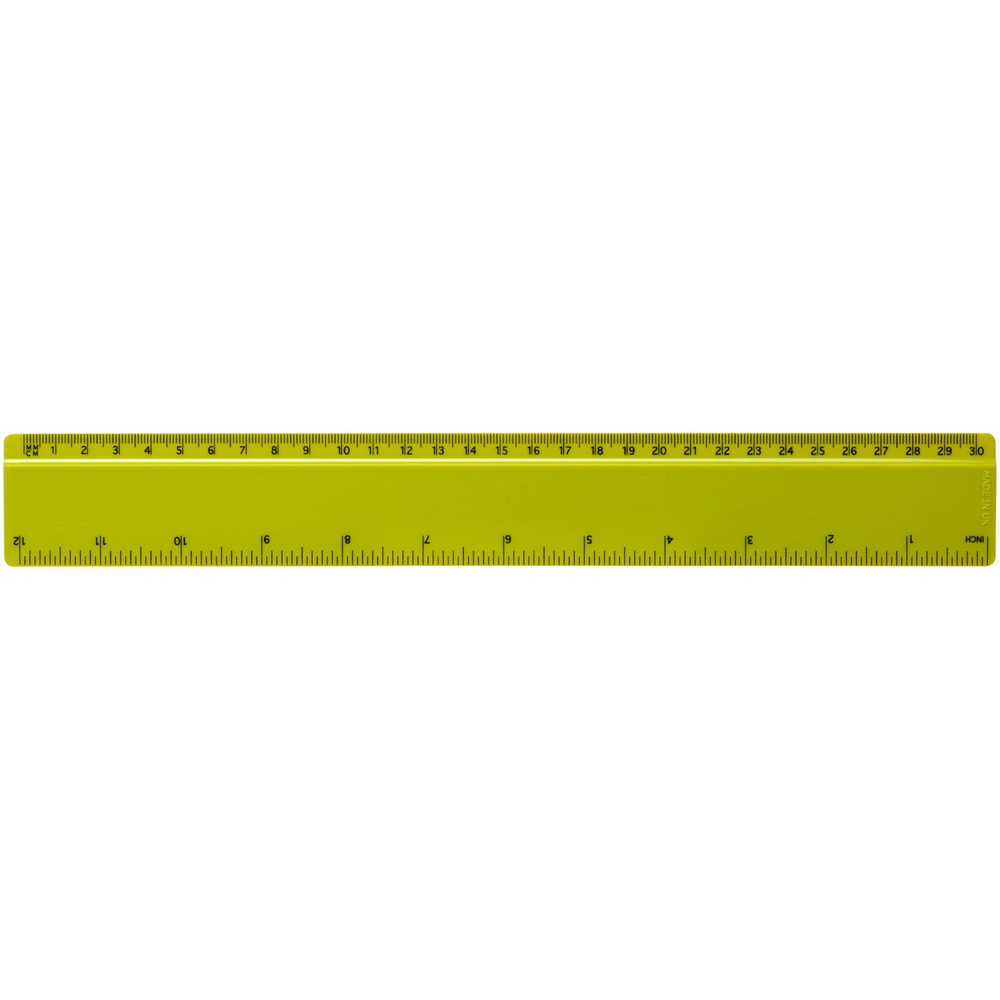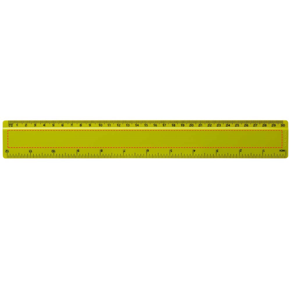 Hard kunststof liniaal met zowel markeringen in inches als centimeters. Let op, de markeringen op de linialen worden samen met het artwork bedrukt, onbewerkte linialen zijn niet voorzien van markeringen.