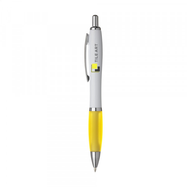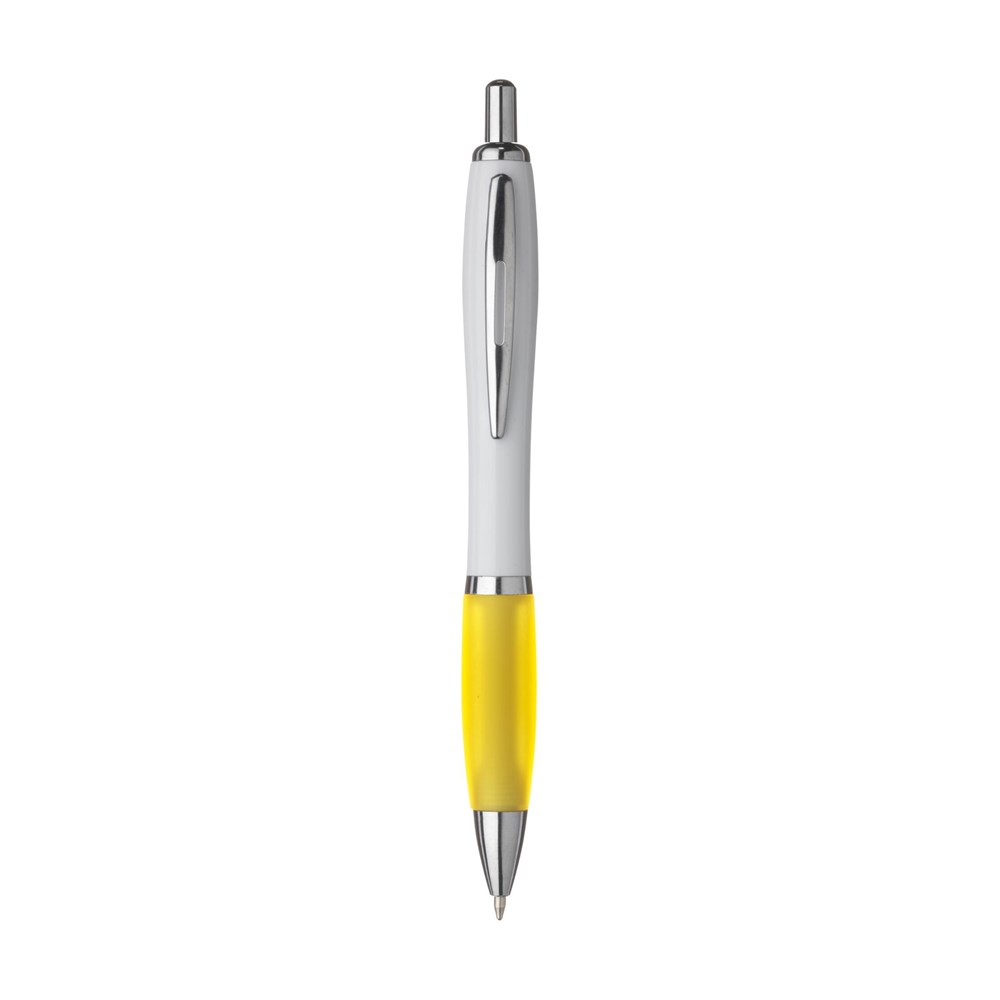 Zwartschrijvende balpen met wiitte houder met gekleurd, gripvast voorstuk en metalen clip.