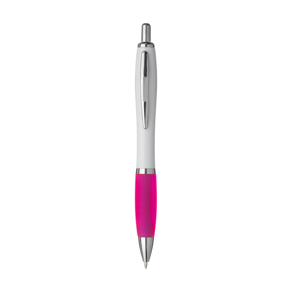 Blauwschrijvende óf zwartschrijvende balpen met witte houder met gekleurd, gripvast voorstuk en metalen clip.