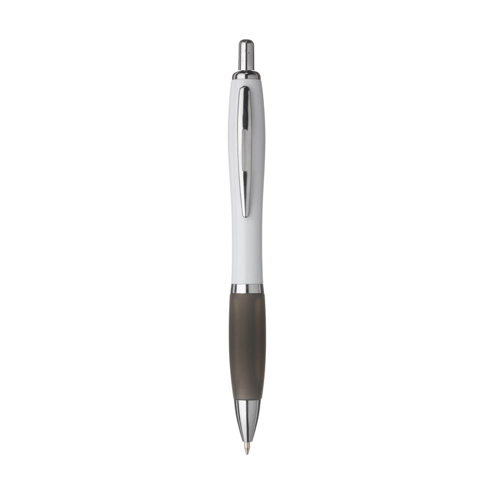 Blauwschrijvende óf zwartschrijvende balpen met witte houder met gekleurd, gripvast voorstuk en metalen clip.