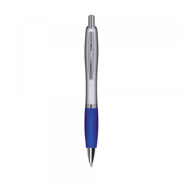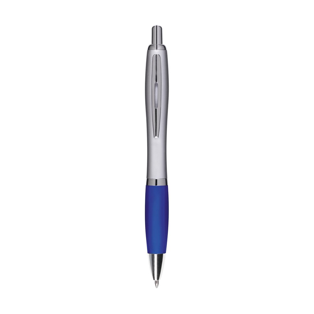 Blauwschrijvende óf zwartschrijvende balpen met gekleurd, gripvast voorstuk en metalen clip.