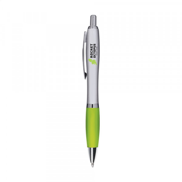 Blauwschrijvende óf zwartschrijvende balpen met gekleurd, gripvast voorstuk en metalen clip. mehr