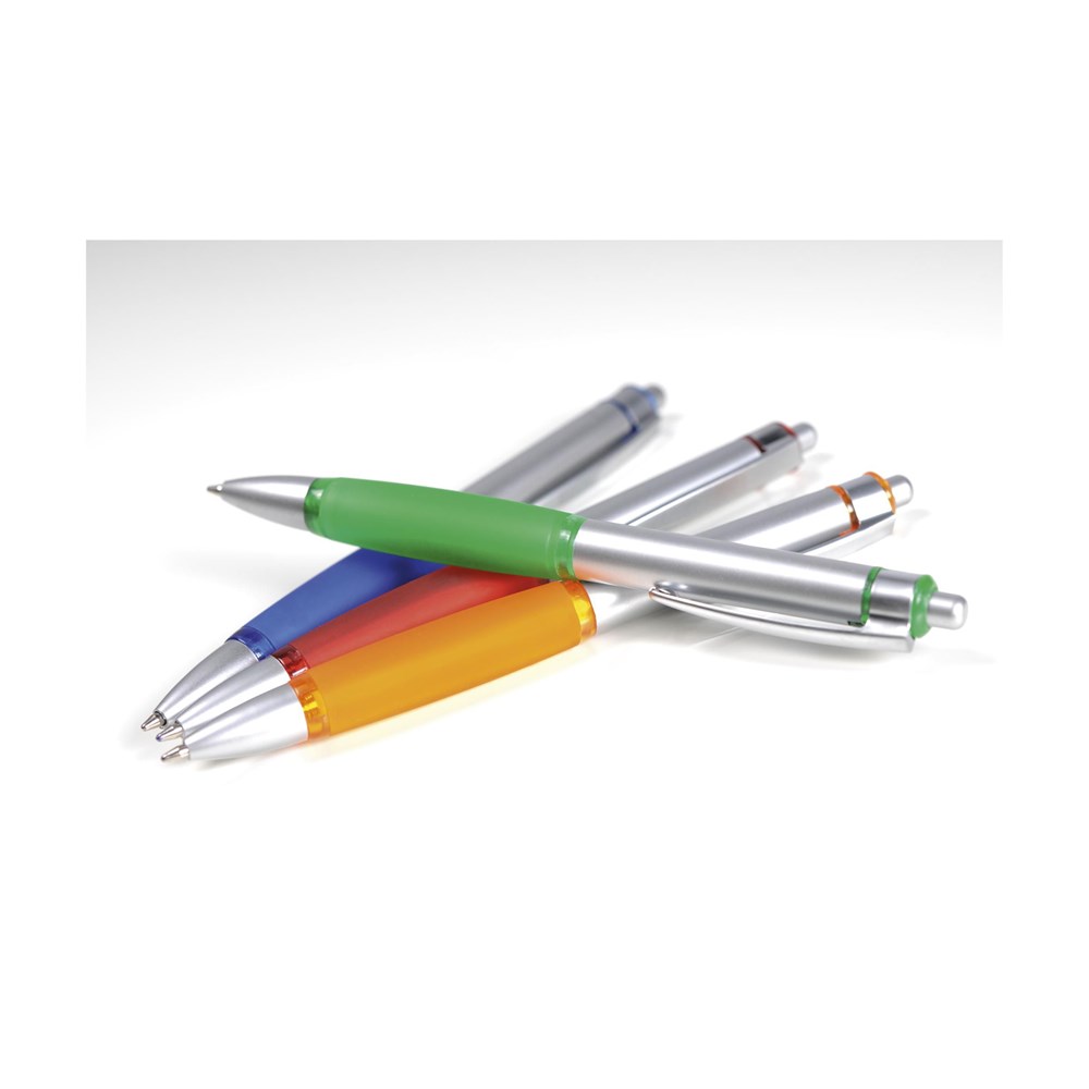 Blauwschrijvende balpen met gripvast, transparantgekleurd rubberen voorstuk, en metalen clip. mehr