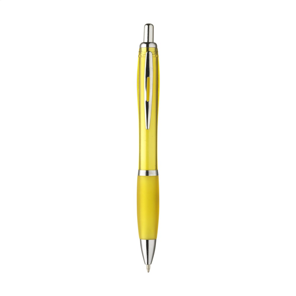 Blauwschrijvende óf zwartschrijvende balpen met transparantgekleurde houder, gripvast voorstuk en metalen clip.
