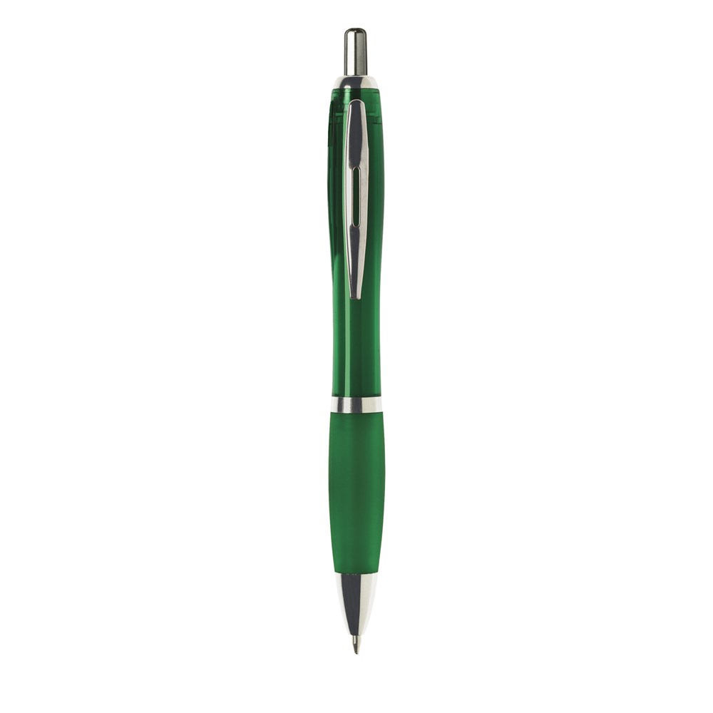Blauwschrijvende óf zwartschrijvende balpen met transparantgekleurde houder, gripvast voorstuk en metalen clip.