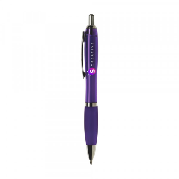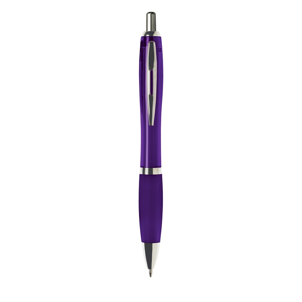 Blauwschrijvende óf zwartschrijvende balpen met transparantgekleurde houder, gripvast voorstuk en metalen clip.