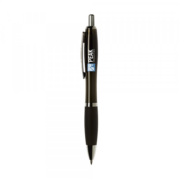 Blauwschrijvende óf zwartschrijvende balpen met transparantgekleurde houder, gripvast voorstuk en metalen clip.