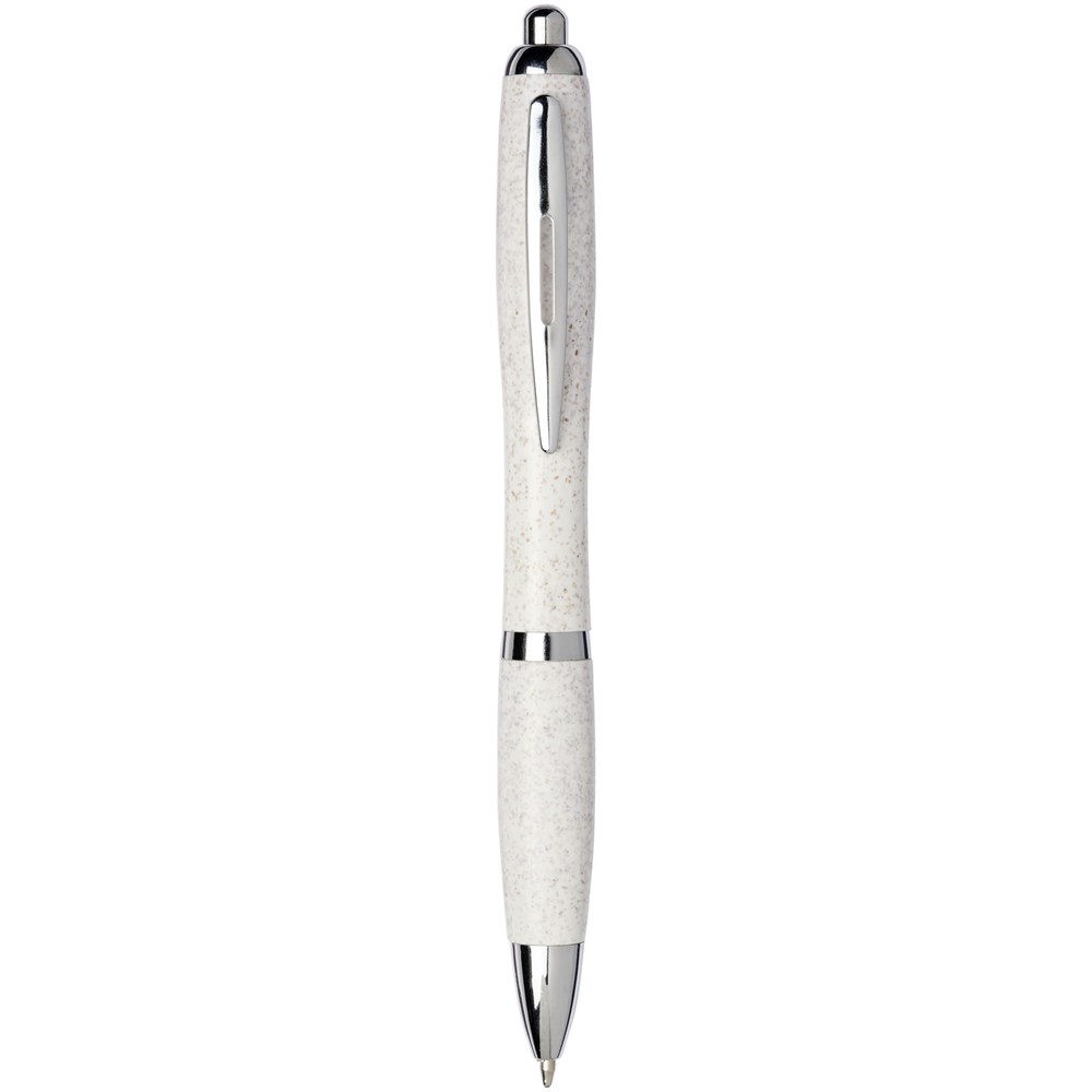 Balpen met klikmechanisme, met een huls van tarwestro en afgewerkt met opvallende chroomkleurige details. Na het oogsten van de tarwekorrels blijft er tarwestro over, waardoor er minder plastic wordt gebruikt.
