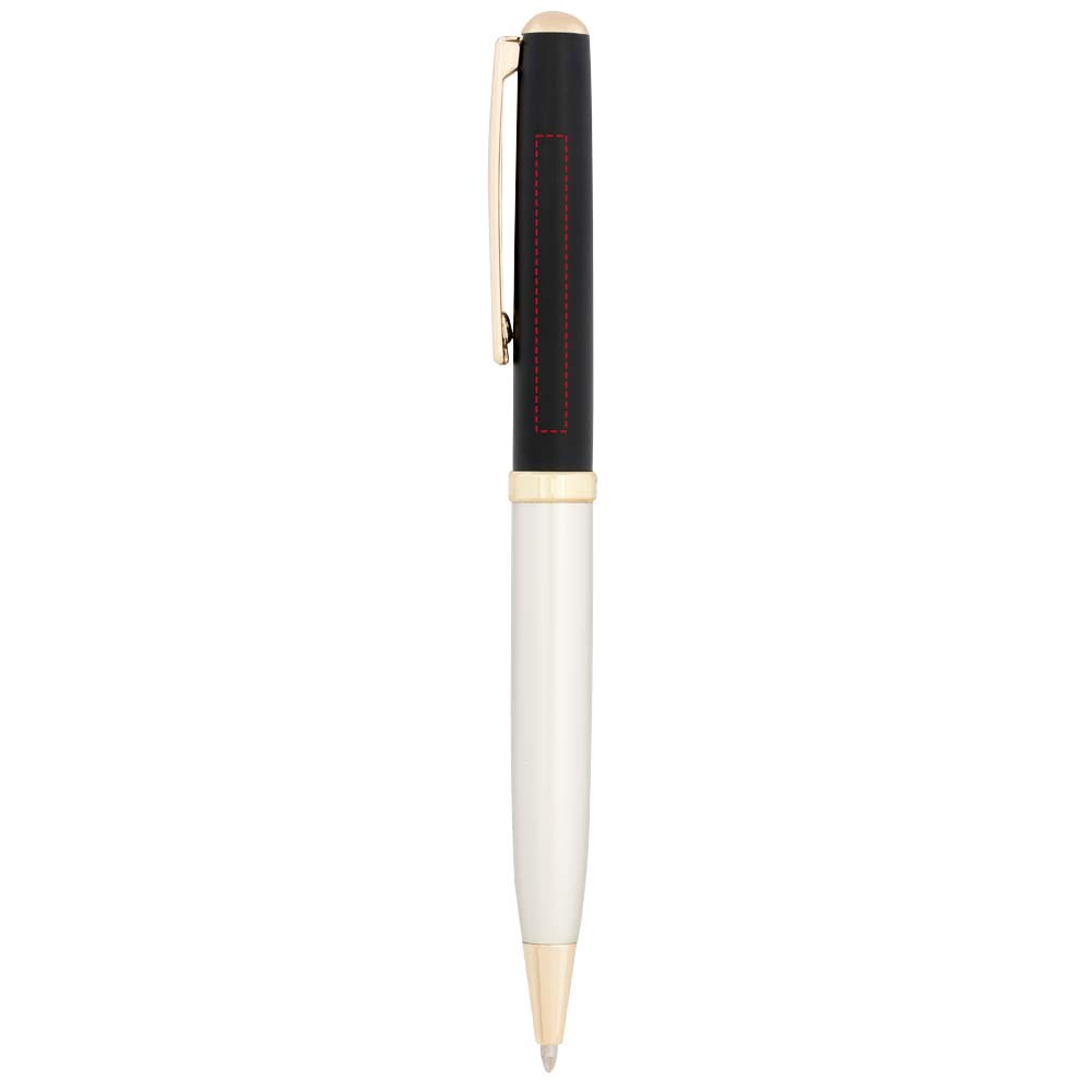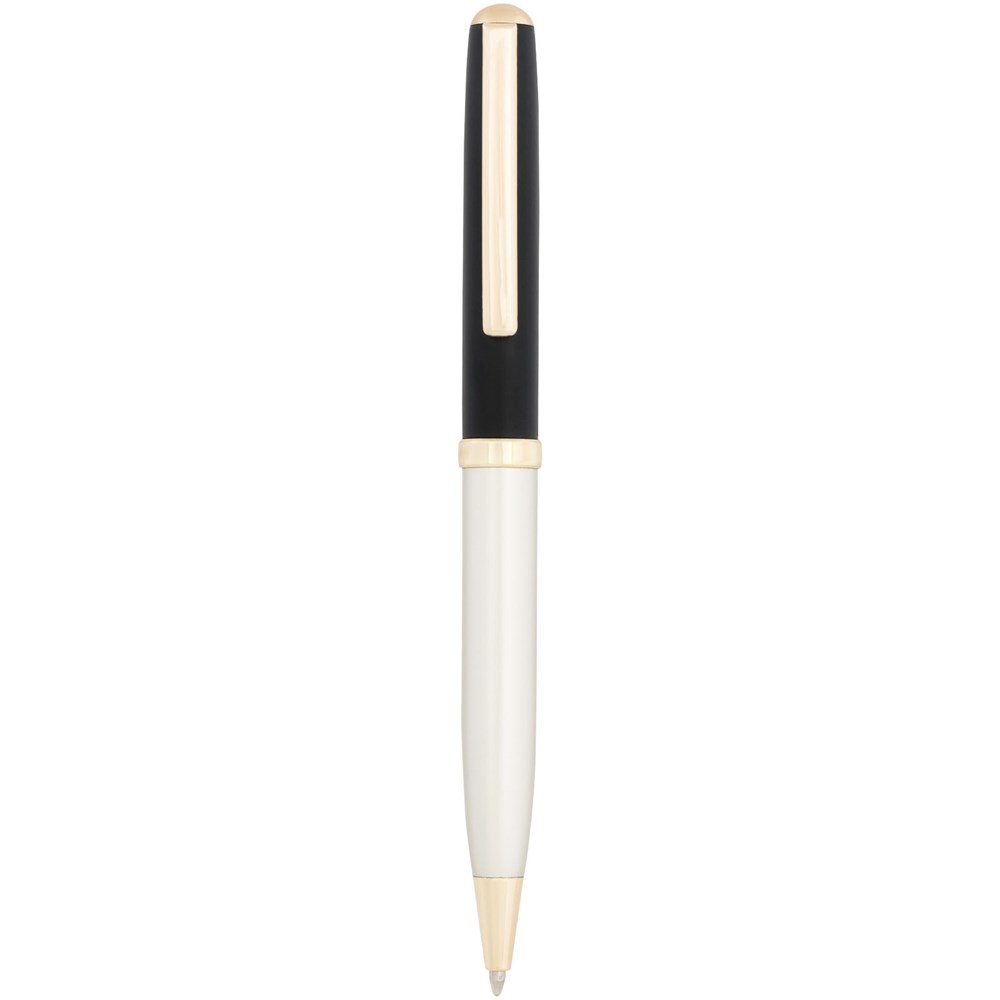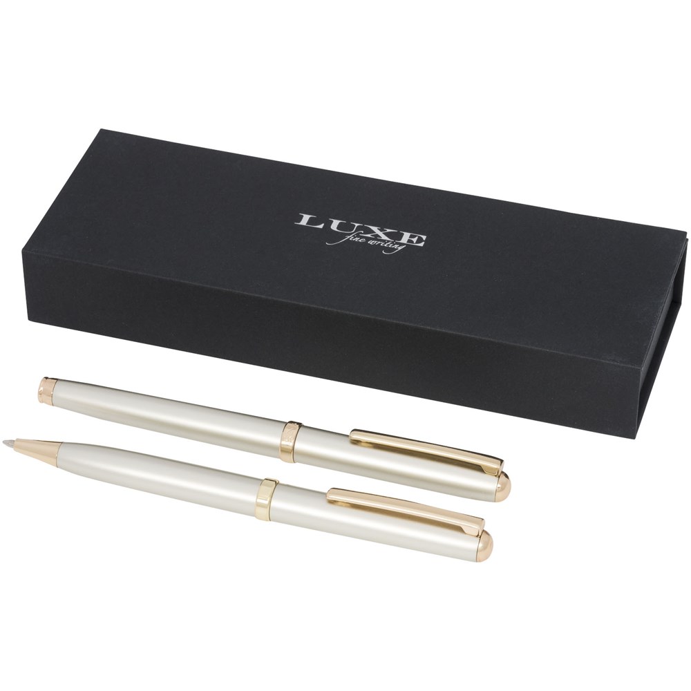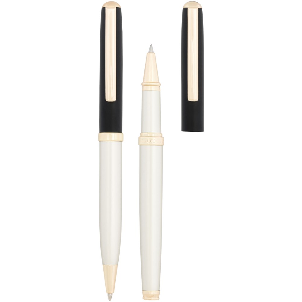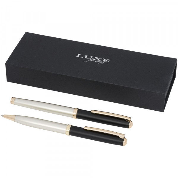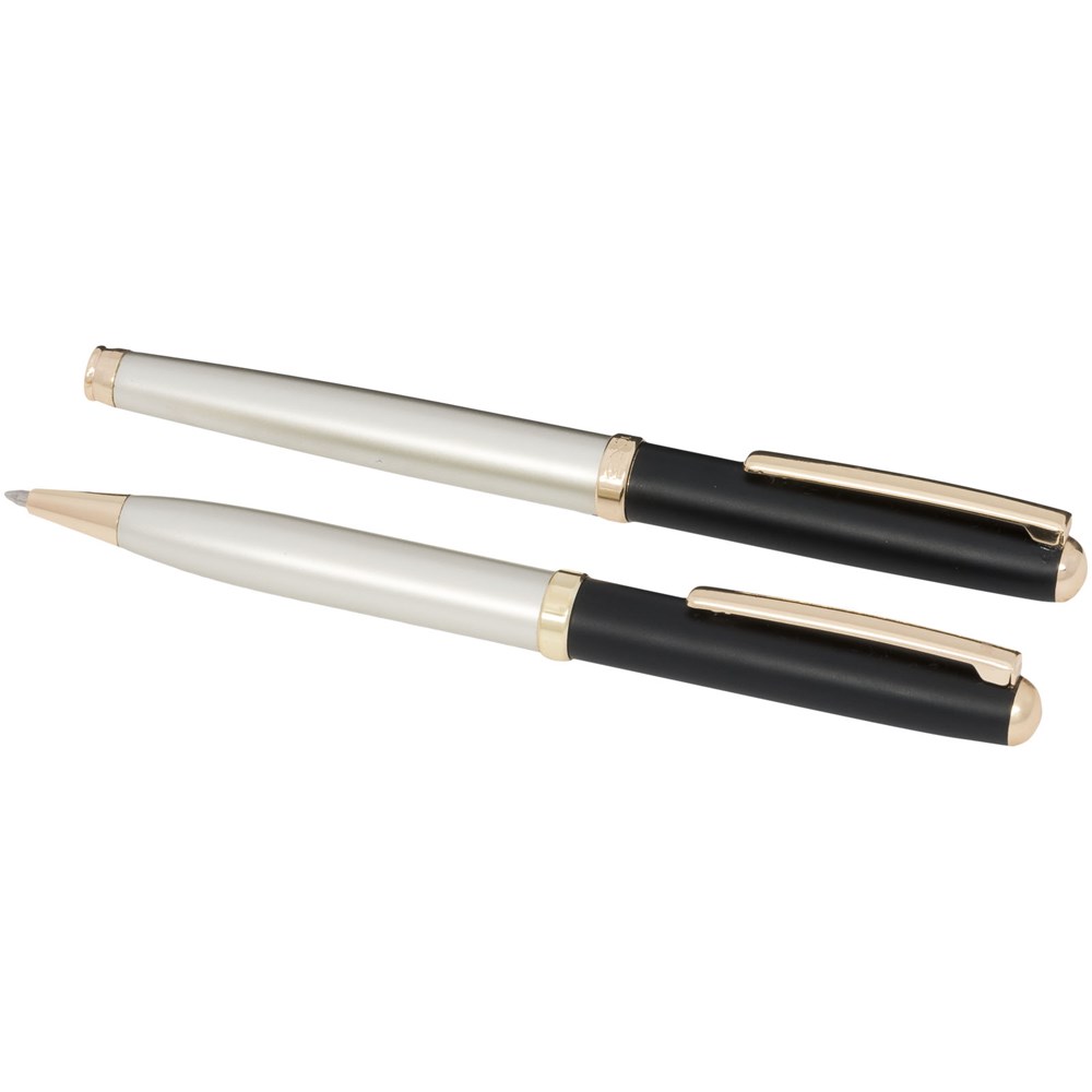 Een moderne pennenset bestaande uit een balpen met draaimechanisme en een rollerbalpen met dop, geleverd in een luxe geschenkverpakking. Allemaal afgewerkt met een matgouden vat en glanzende gouden onderdelen. Inclusief een premium vulling voor beide pennen. Bovenhuls met goudgeverfde onderlaag. Grootte van de balpen: 13,4cm, 1,05 cm, gewicht: 23 gr, schrijflengte: 800 m. Grootte van de rollerbalpen: 13,5 cm, 1,05 cm, gewicht: 23 gr, schrijflengte: 400 m.