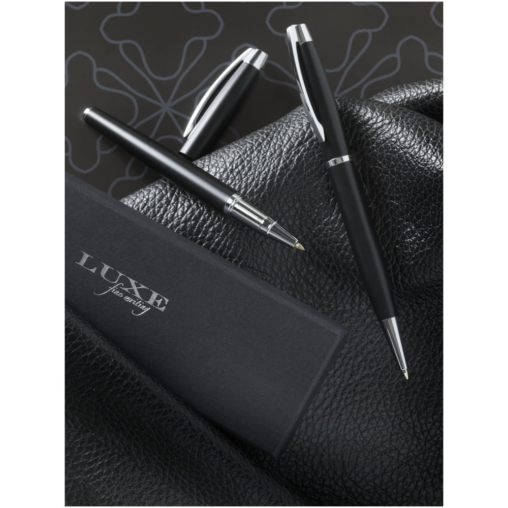 Duo pen cadeauset met een balpen met draaimechanisme en een cap type rollerpen. Inclusief een premium zwarte vulling. Verpakt in een luxe geschenkverpakking.