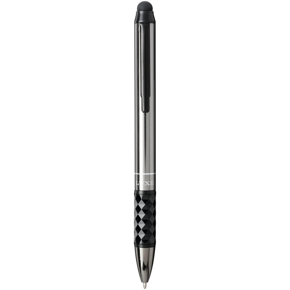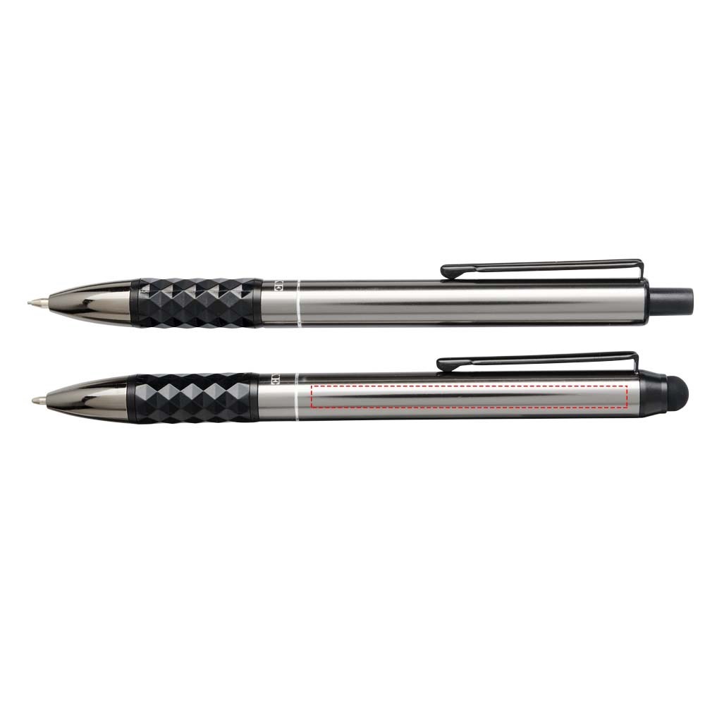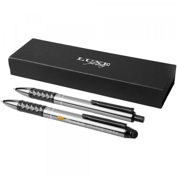 Balpen en vulpotlood duo geschenkset met zwarte kunststof handgreep. Voorzien van een diamantgeslepen patroon, bronzen geanodiseerde aluminium bovenhuls en brons-koperen punt, en wordt geleverd in een luxe geschenkverpakking. Balpen: 14 cm x 1,07 cm, gewicht: 16,5 gr, schrijflengte: 800 m, vulpotlood: 13,93 cm x 1,07 cm, gewicht: 16 gr.