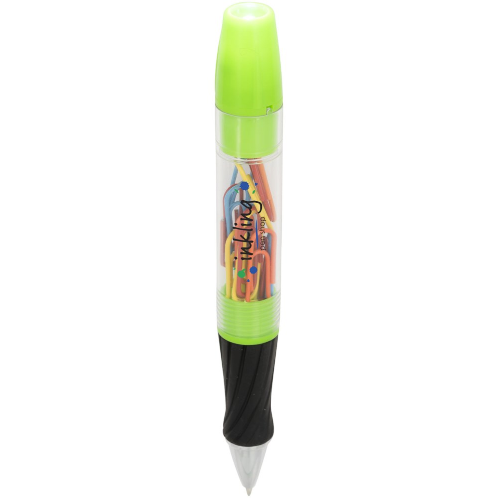 Balpen met draaimechanisme aan de voorzijde, afschroefbare schacht met paperclips en LED-lampje met draaimechanisme aan het uiteinde. inclusief batterijen.