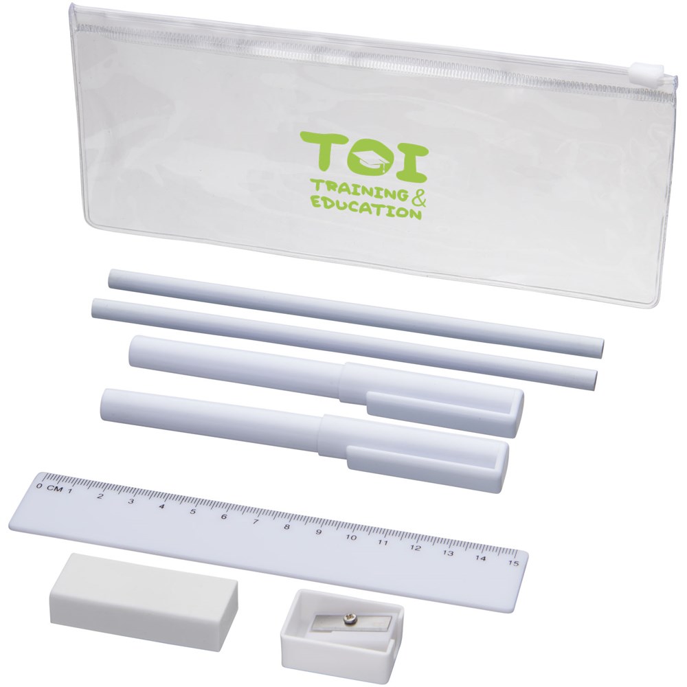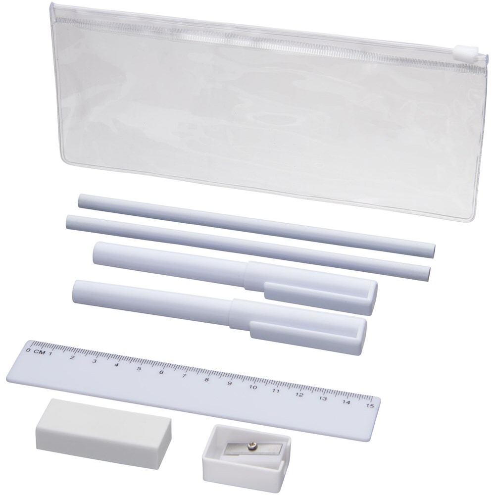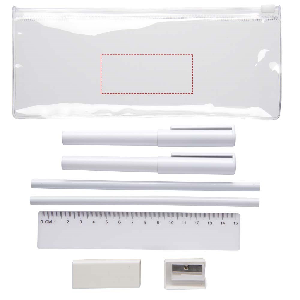 PVC pennenset met 2 balpennen (1 met zwarte inkt, de andere met blauw), 2 potloden, een liniaal, een puntenslijper en een gum.