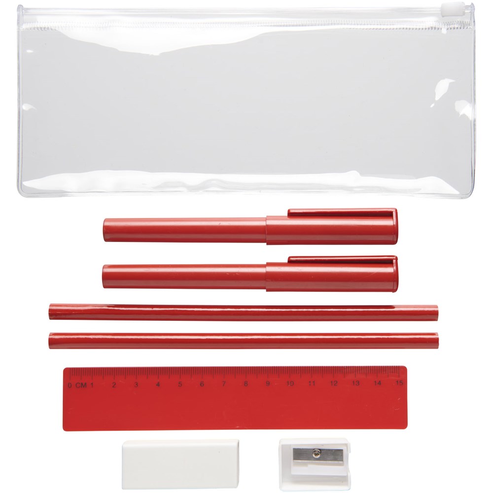 PVC pennenset met 2 balpennen (1 met zwarte inkt, de andere met blauw), 2 potloden, een liniaal, een puntenslijper en een gum.