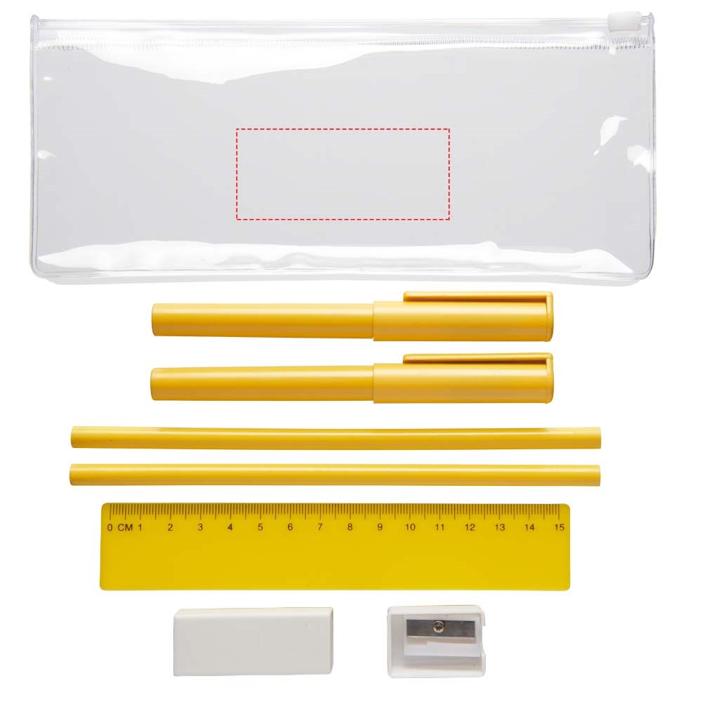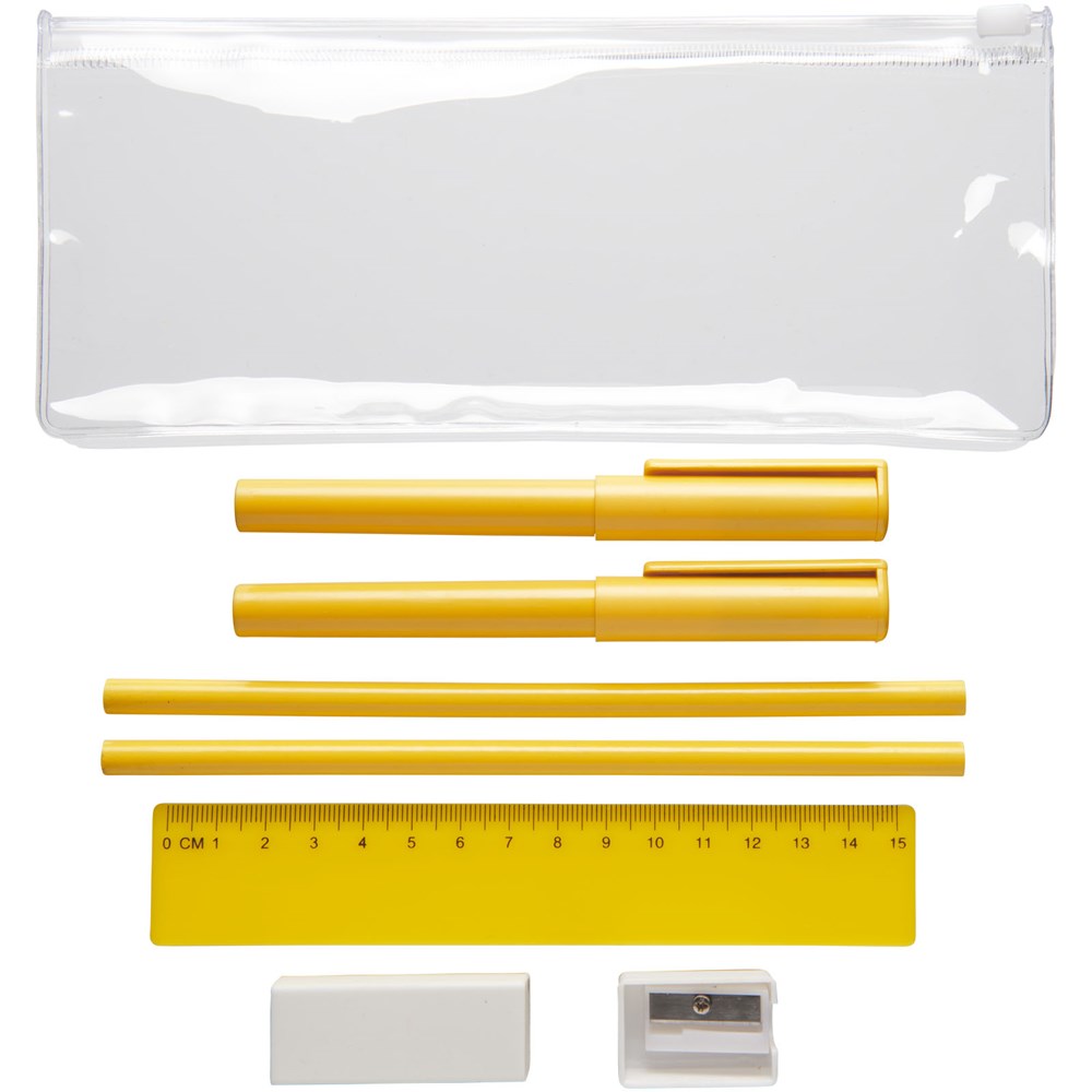 PVC pennenset met 2 balpennen (1 met zwarte inkt, de andere met blauw), 2 potloden, een liniaal, een puntenslijper en een gum.