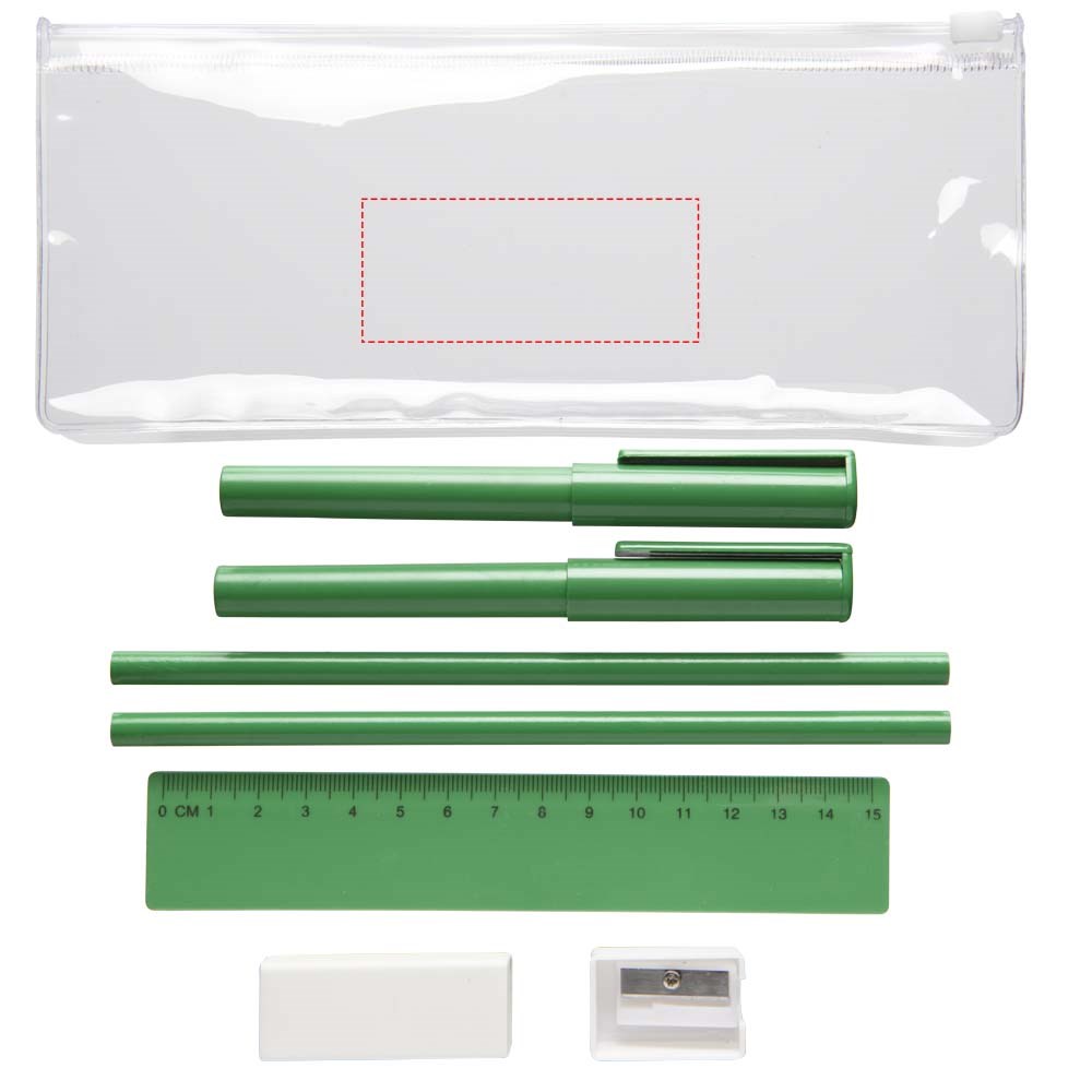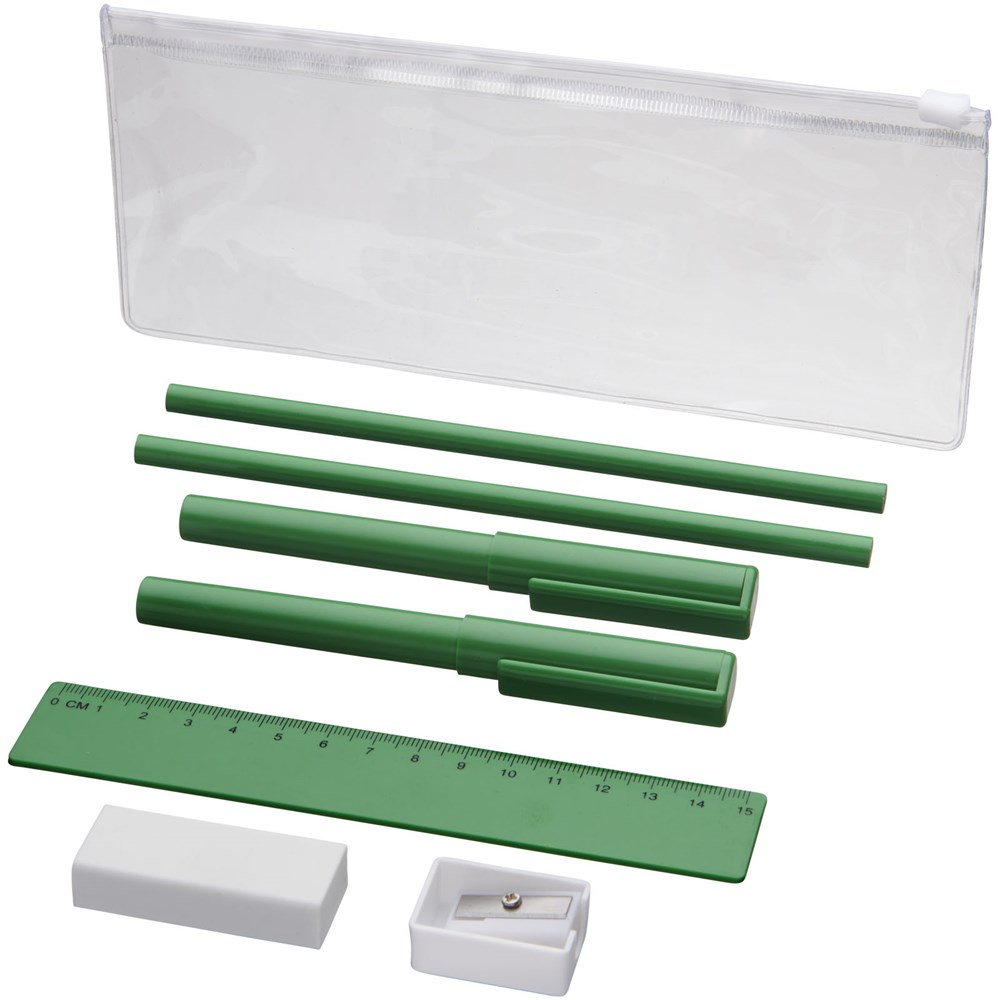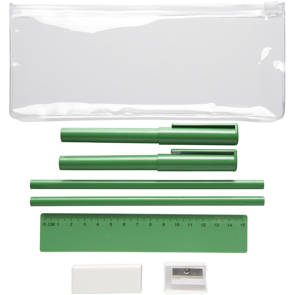 PVC pennenset met 2 balpennen (1 met zwarte inkt, de andere met blauw), 2 potloden, een liniaal, een puntenslijper en een gum.