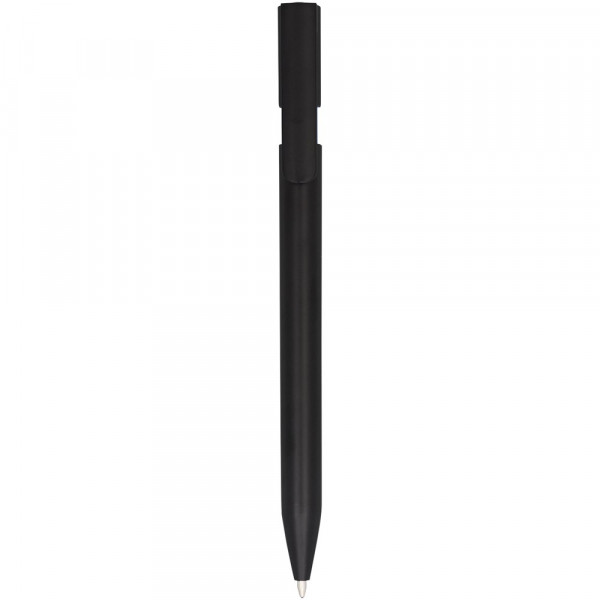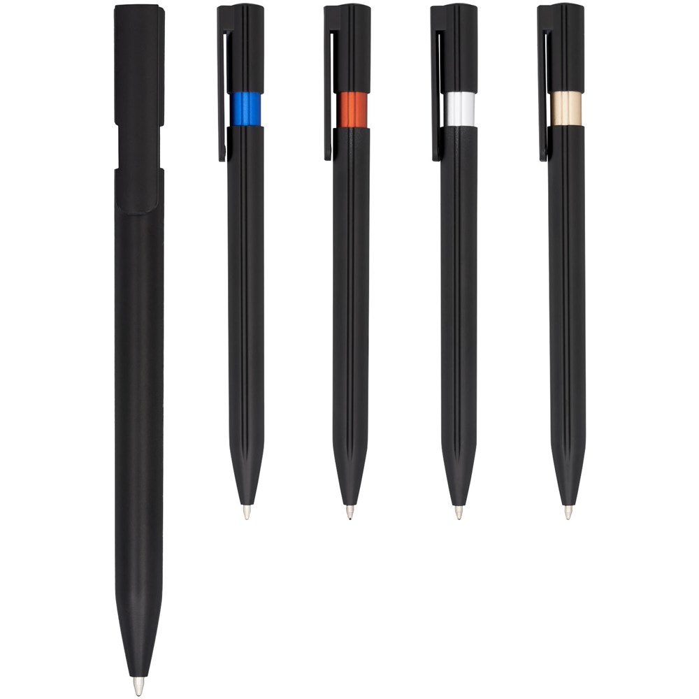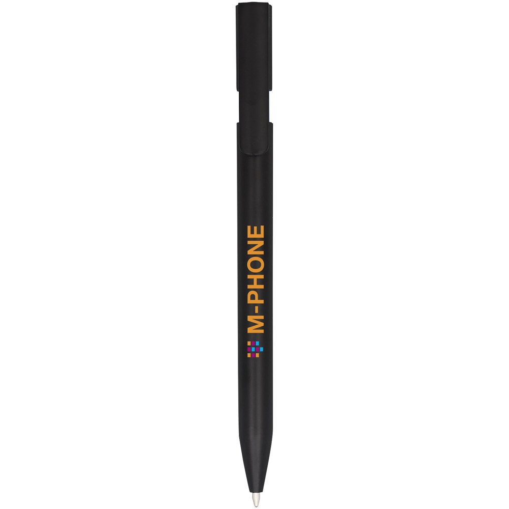 Zwarte pen met gekleurde details. Heeft een klikmechanisme. Blauwschrijvend.