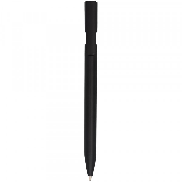 Zwarte pen met gekleurde details. Heeft een klikmechanisme. Blauwschrijvend.