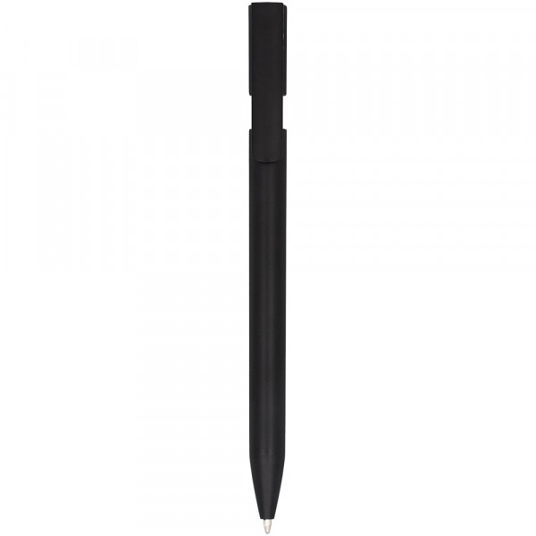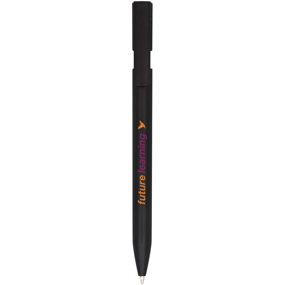 Zwarte pen met gekleurde details. Heeft een klikmechanisme. Blauwschrijvend.