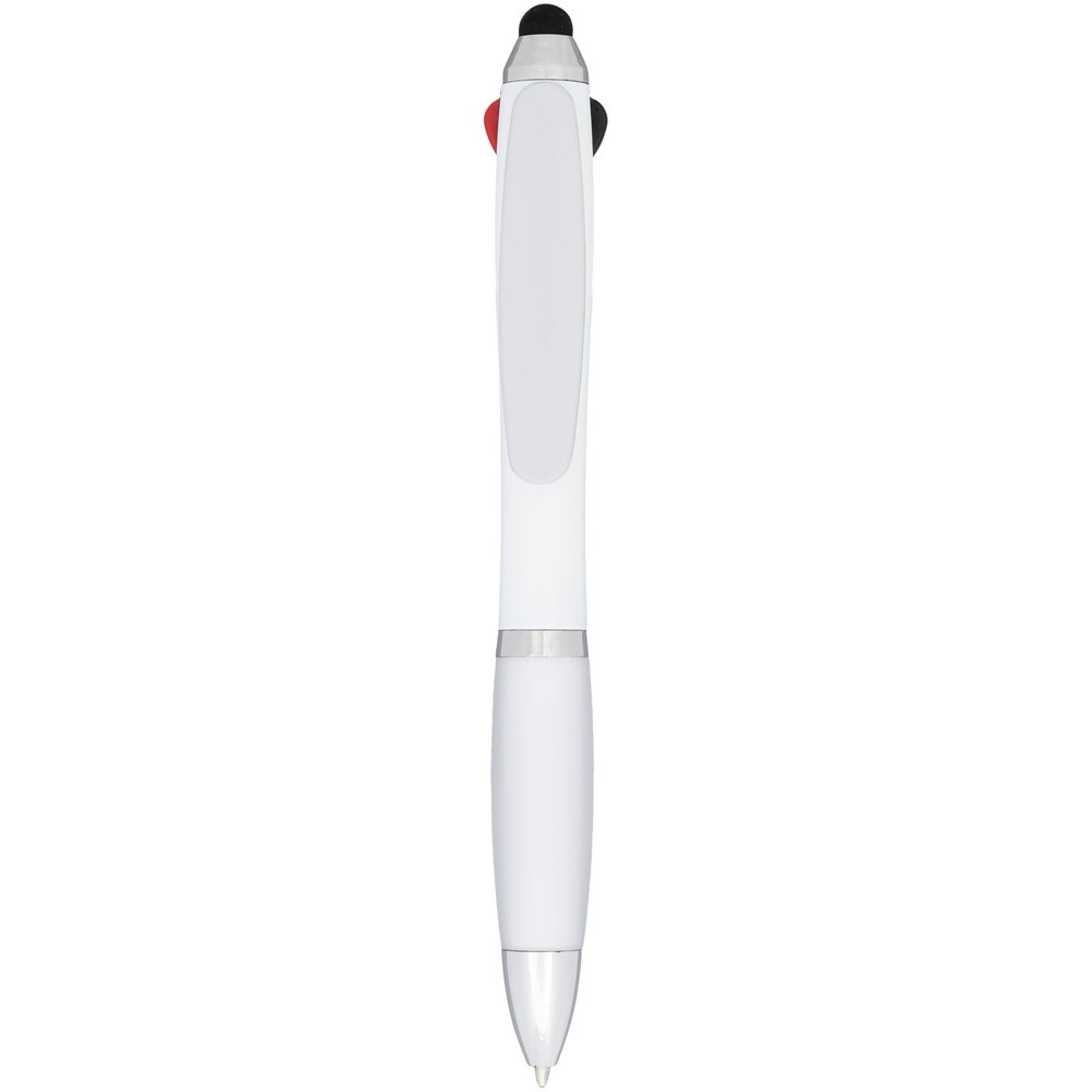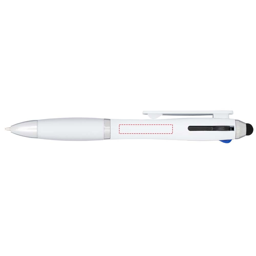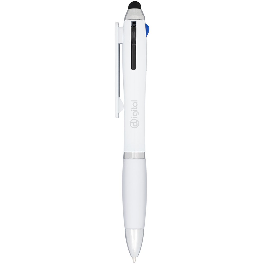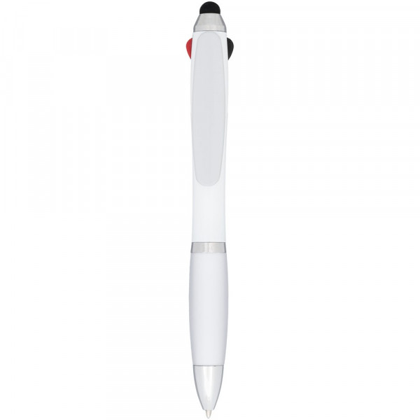 Nash-balpen met witte romp en kleurrijke greep en clip. Vier functies in één voordelige pen, rode, zwarte en blauwe inkt, plus en stylus punt. Balpen met klikmechanisme en soft touch greep. Zwartschrijvend.