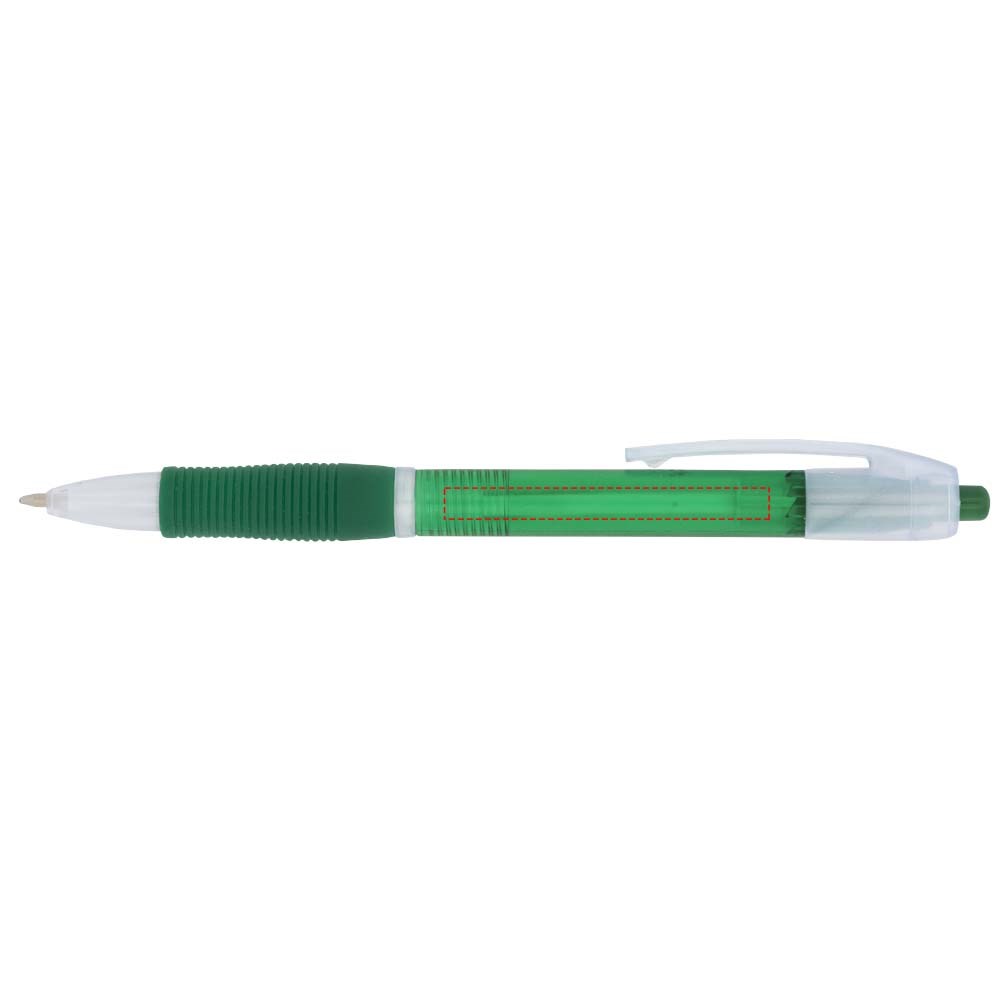 Kleurrijke klik balpen met bijpassende kleur rubberen grip. Blauwschrijvend.