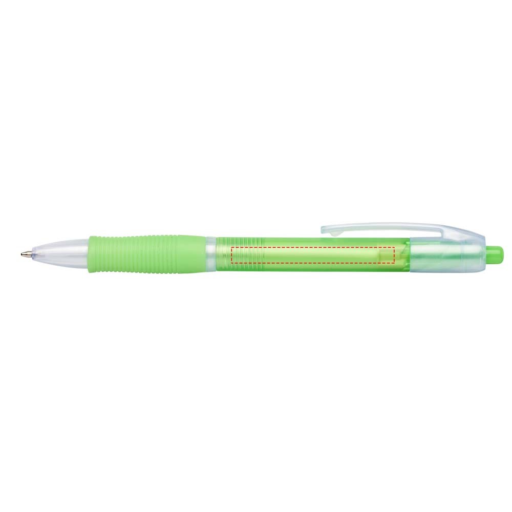 Kleurrijke klik balpen met bijpassende kleur rubberen grip. Blauwschrijvend.