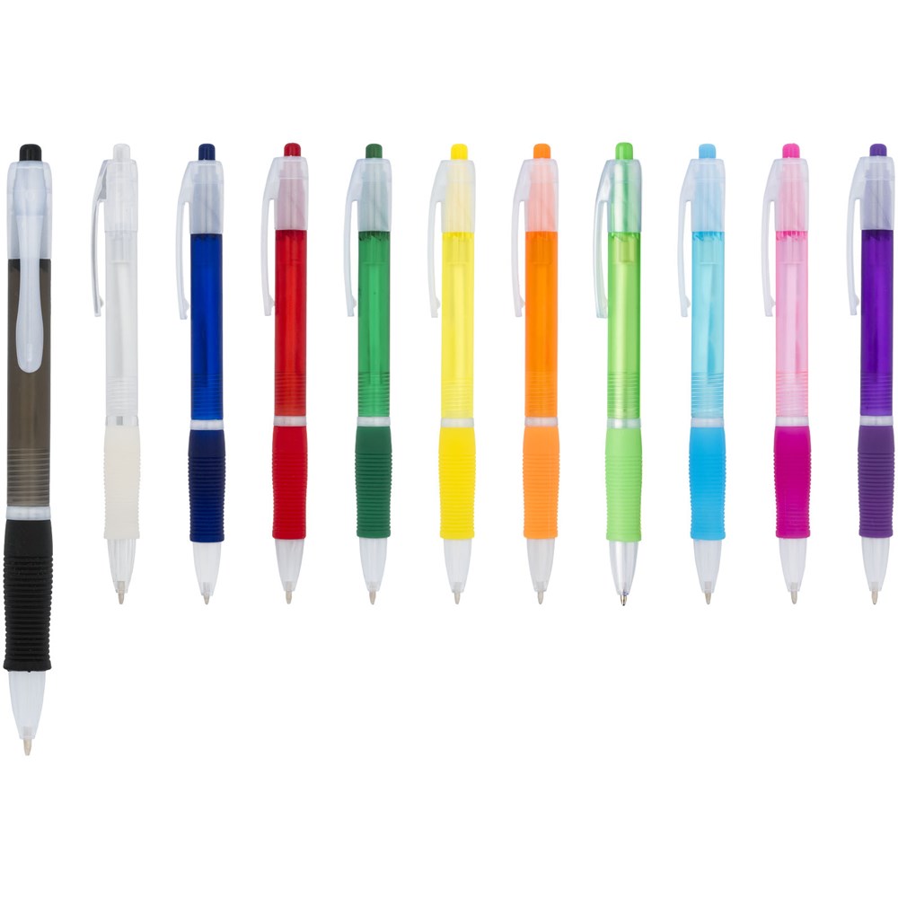 Kleurrijke klik balpen met bijpassende kleur rubberen grip. Blauwschrijvend.