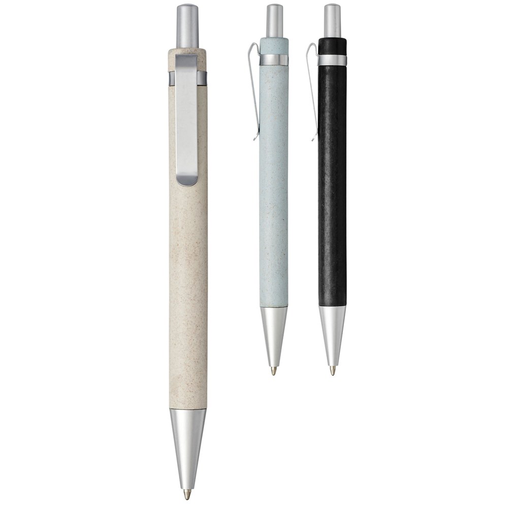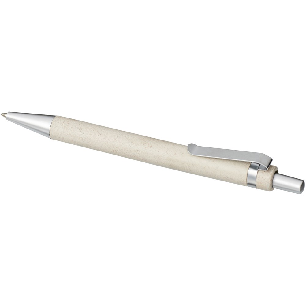 Balpen met moderne uitstraling en klikmechanisme, met een huls van tarwestro en afgewerkt met opvallende chroomkleurige details. Na het oogsten van de tarwekorrels blijft er tarwestro over, waardoor er minder plastic wordt gebruikt.