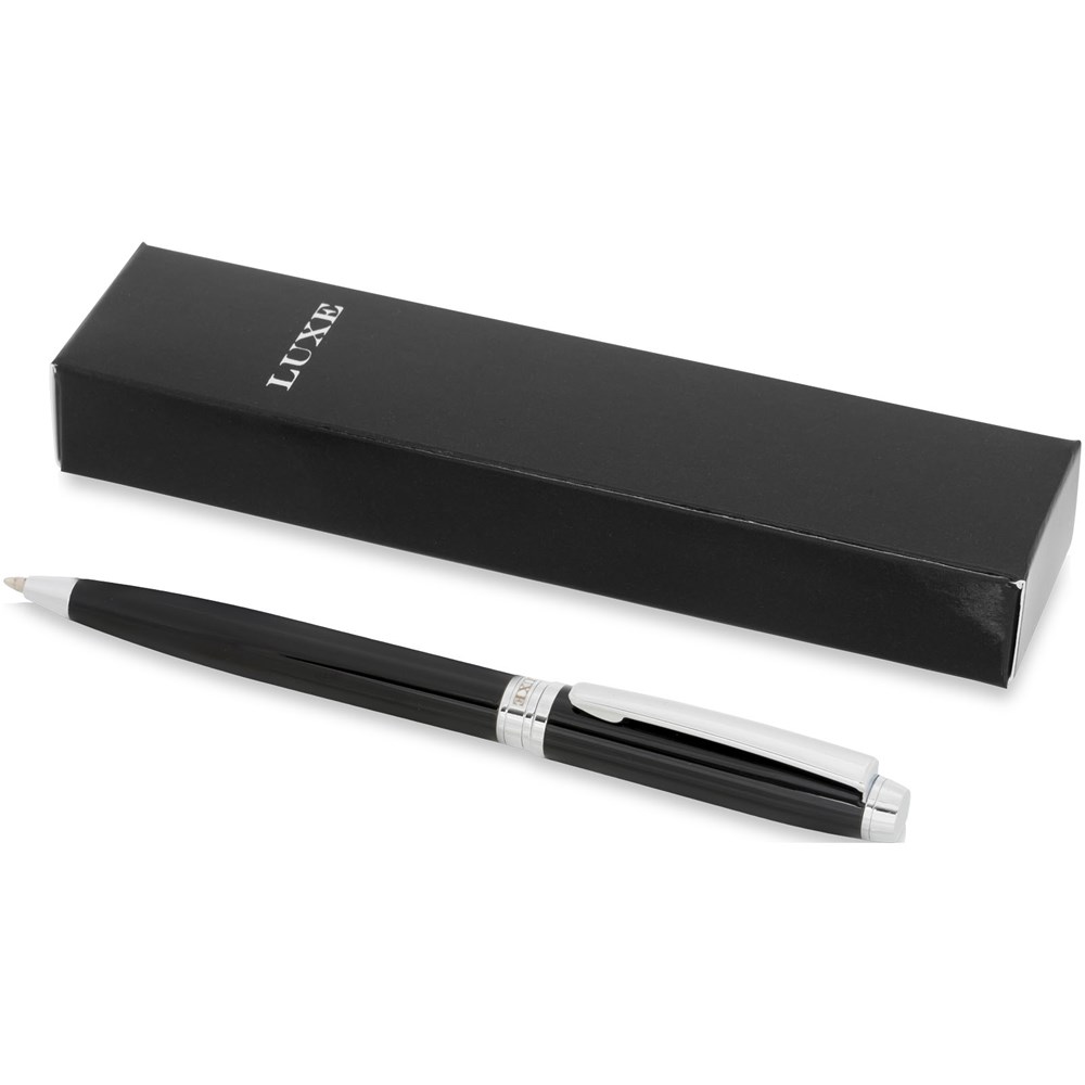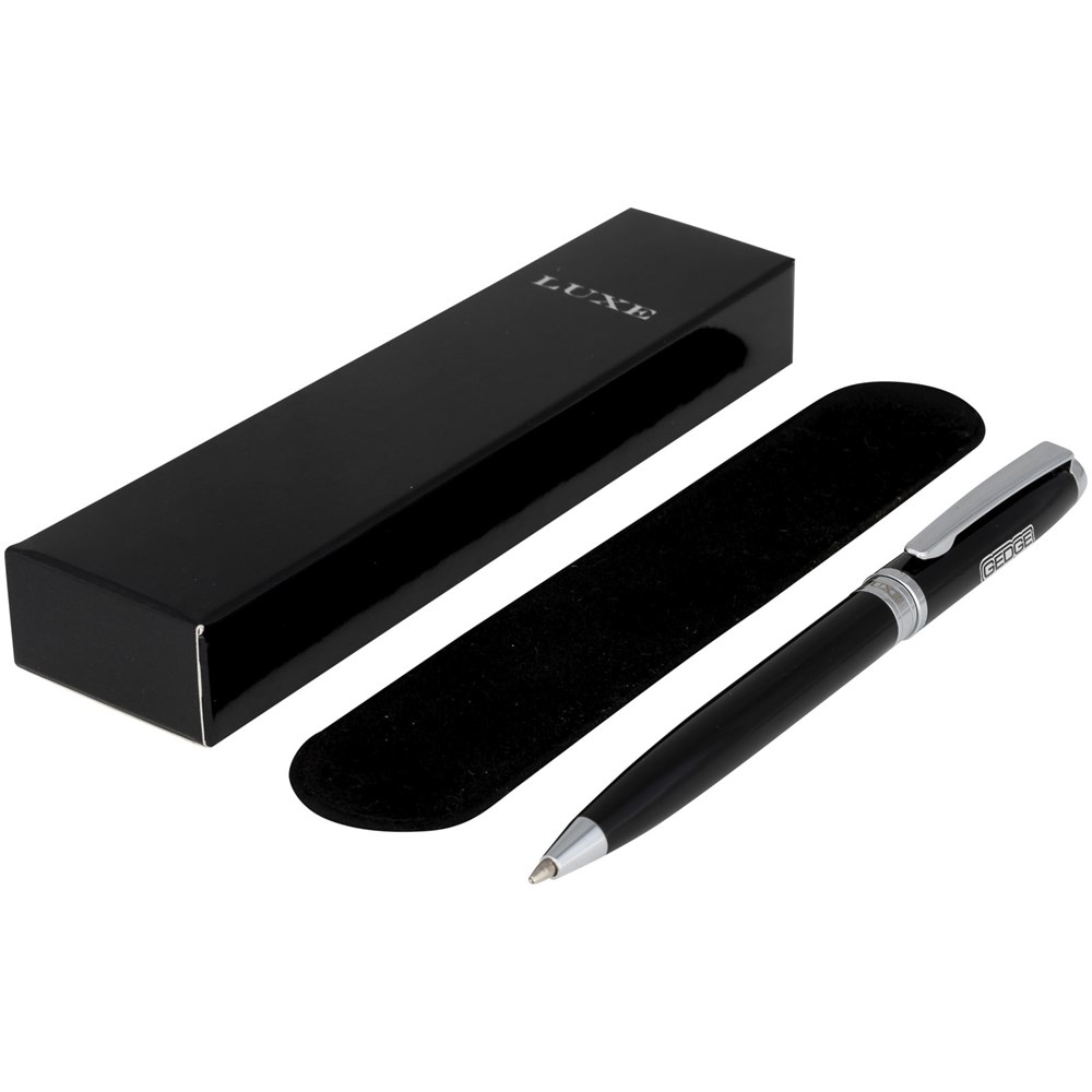 Balpen met exclusief design en gekleurde boven en onderhuls. Met een hoogwaardige zwarte navulling en een fluwelen zakje. Verpakt in een ''LUXE'' geschenkverpakking (grootte: 17 x 3,5 x 2 cm).