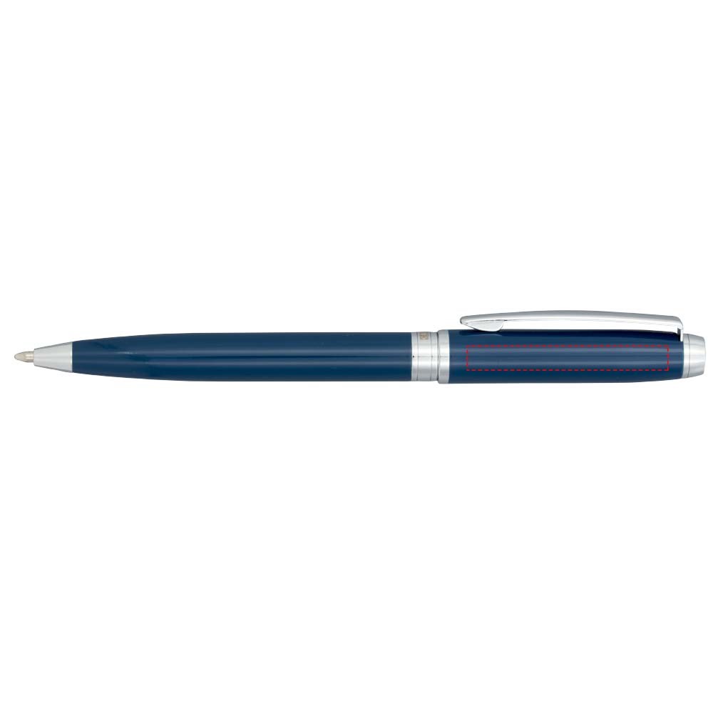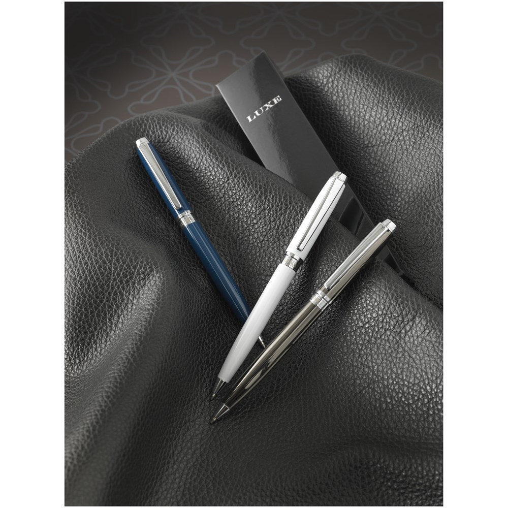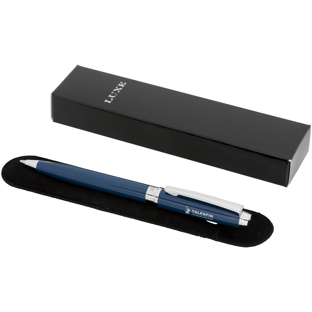 Balpen met exclusief design en gekleurde boven en onderhuls. Met een hoogwaardige zwarte navulling en een fluwelen zakje. Verpakt in een ''LUXE'' geschenkverpakking (grootte: 17 x 3,5 x 2 cm).