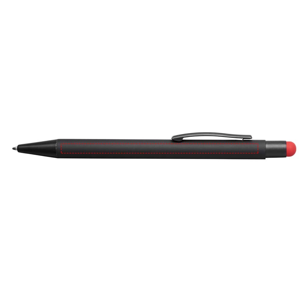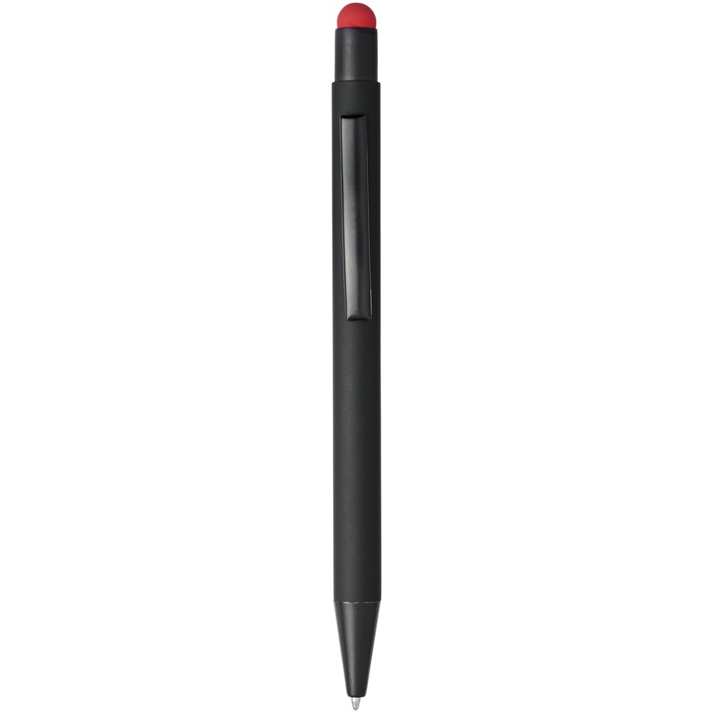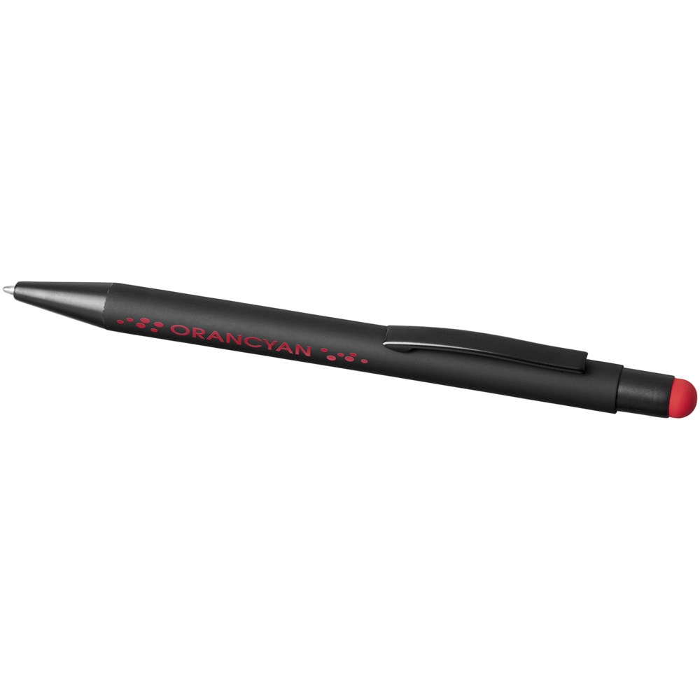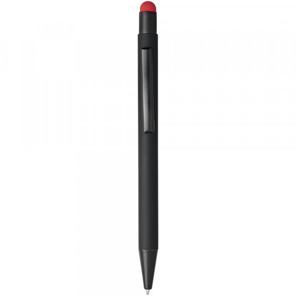 Rubber gecoate stylus balpen met klikmechanisme. De kleur van de styluspunt komt overeen met de lasergegraveerde onderlaag van de pen. De pen heeft een metalen clip, rubberen stylus en is gemaakt van aluminium. Schrijflengte: 450 m.