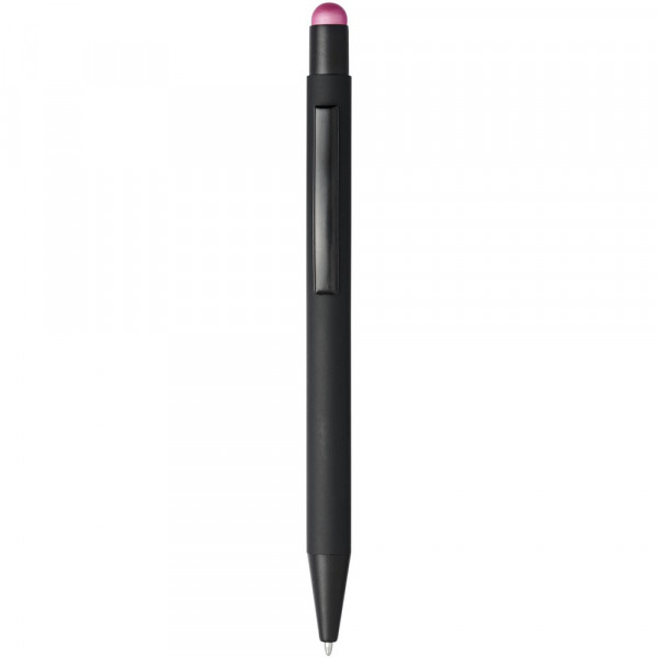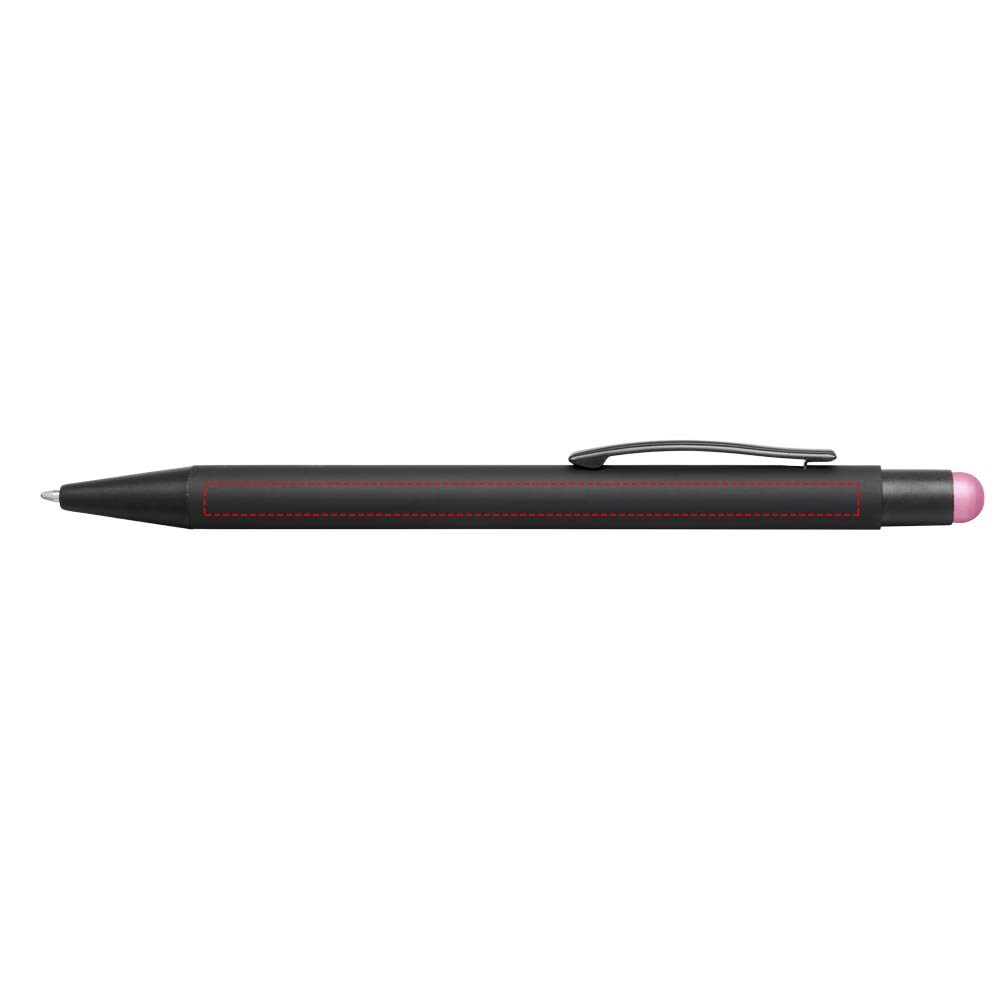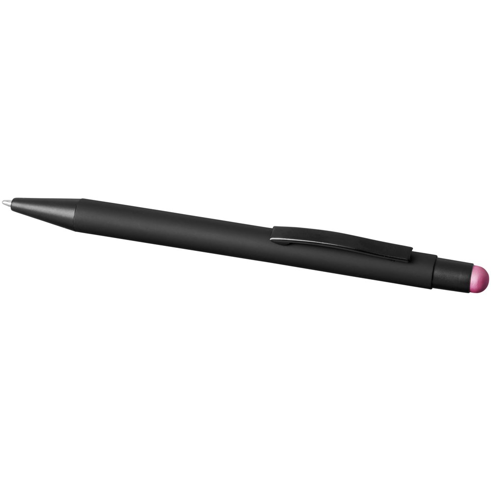 Rubber gecoate stylus balpen met klikmechanisme. De kleur van de styluspunt komt overeen met de lasergegraveerde onderlaag van de pen. De pen heeft een metalen clip, rubberen stylus en is gemaakt van aluminium. Schrijflengte: 450 m.