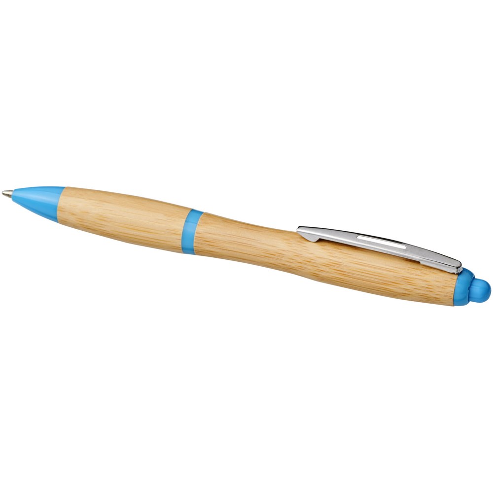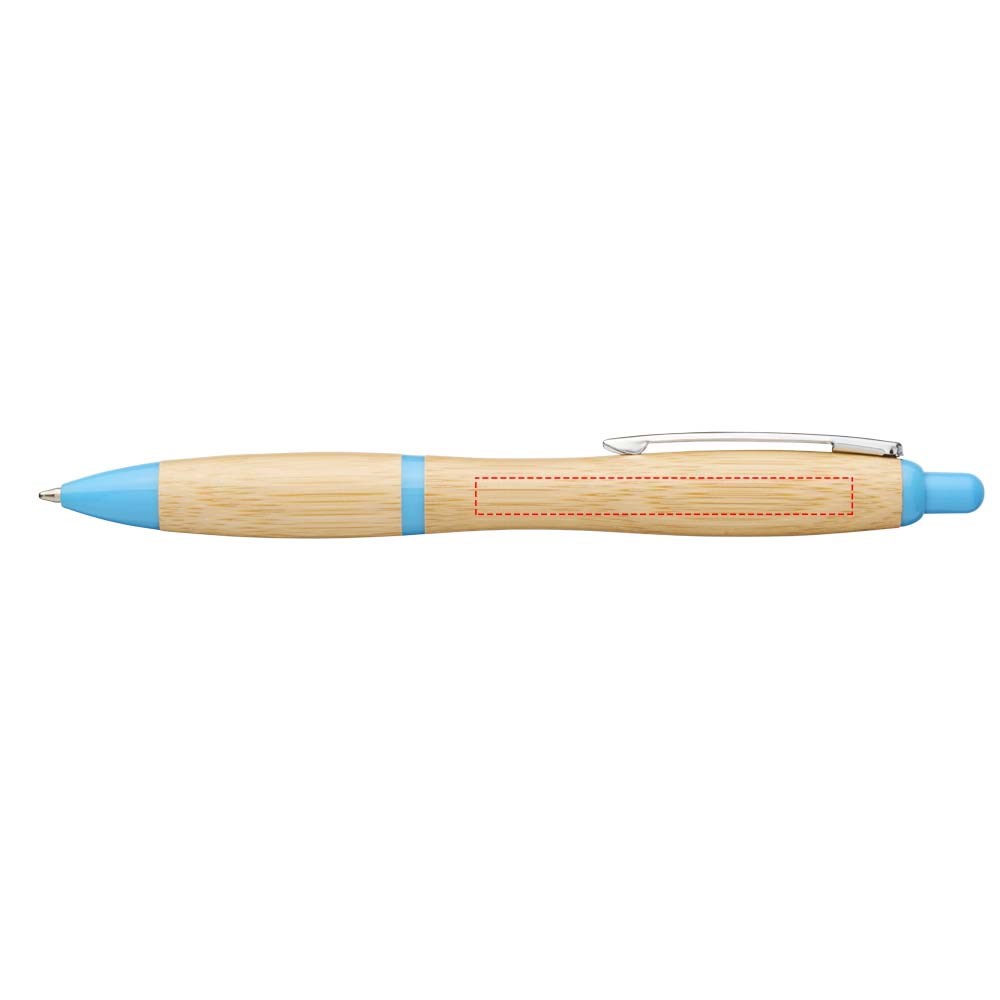 Balpen met klikmechanisme, met een huls van bamboe, geaccentueerd door een verchroomde clip en ABS kunststof sierranden. De kleur van het bamboemateriaal kan variëren.