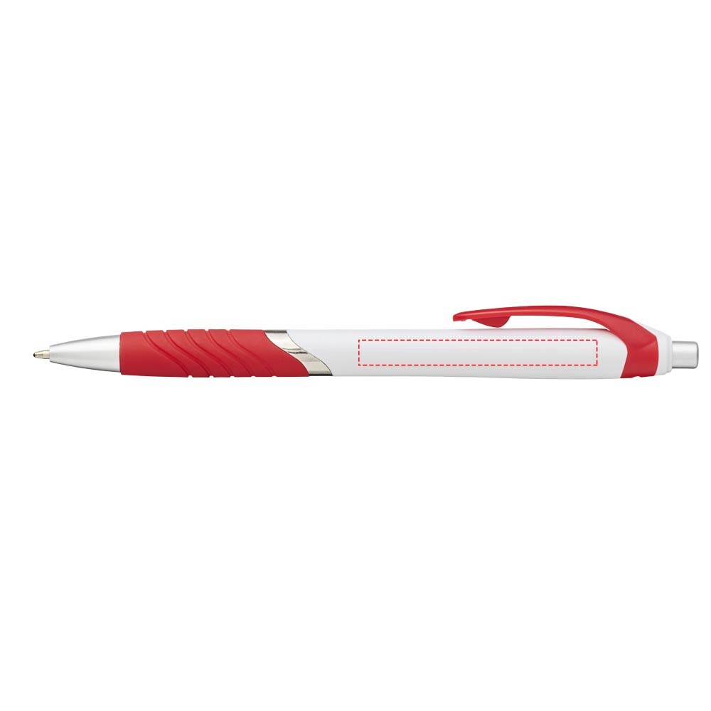 Populaire balpen met klikmechanisme en witte huls, gekleurde clip, rubberen grip en extra zilveren accenten.
