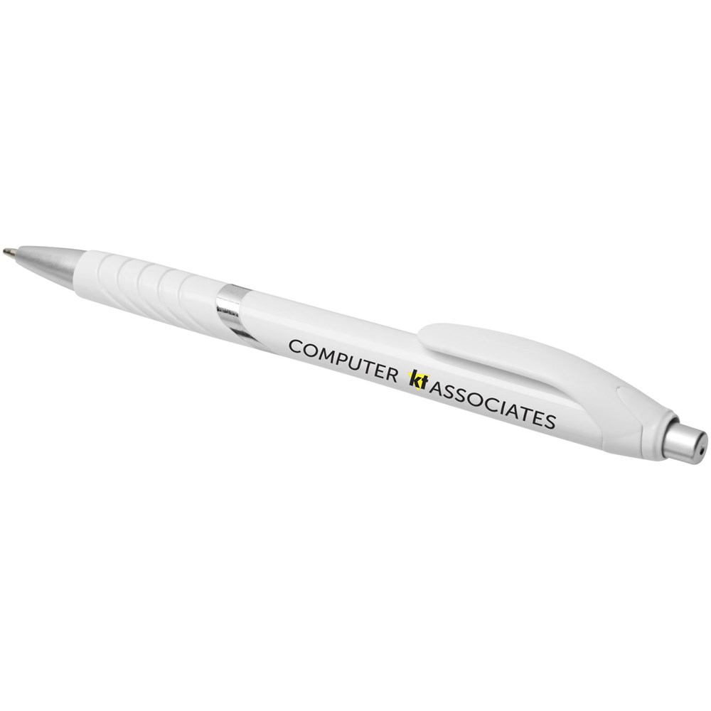 Populaire balpen met klikmechanisme en witte huls, gekleurde clip, rubberen grip en extra zilveren accenten.