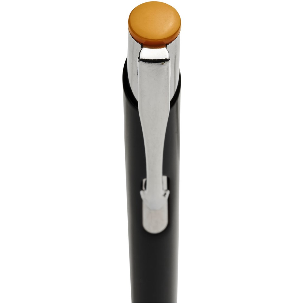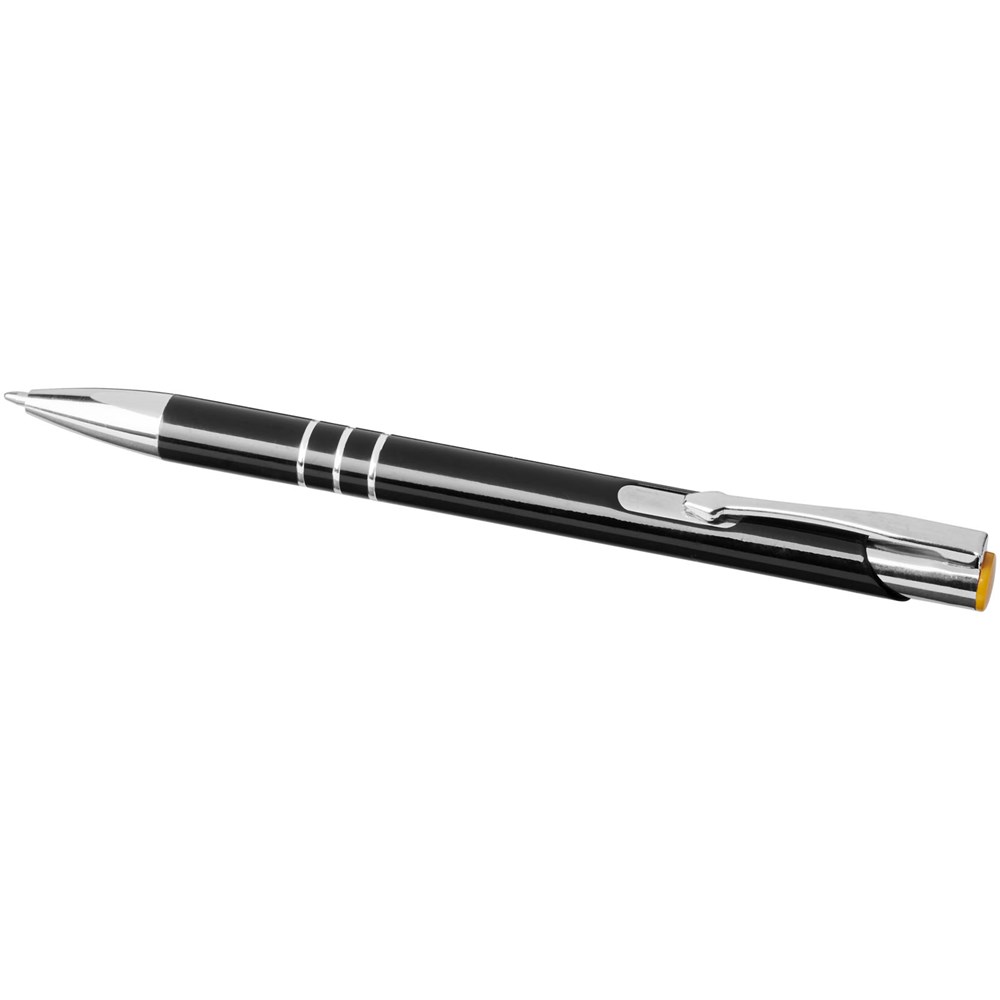 Zwarte balpen met klikmechanisme in verschillende kleuren aan de bovenkant van de pen. Bij het lasergraveren wordt de kleur eronder onthuld, zodat deze overeenkomt met de kleur aan de bovenkant van de pen. De pen heeft een metalen clip, een aluminium huls en een ABS-punt en -bovenkant. Het uitgebreide en populaire Moneta-assortiment is verkrijgbaar in vele verschillende stijlen en afwerkingen.