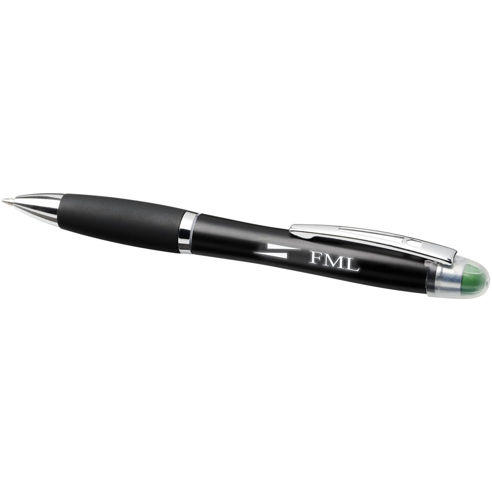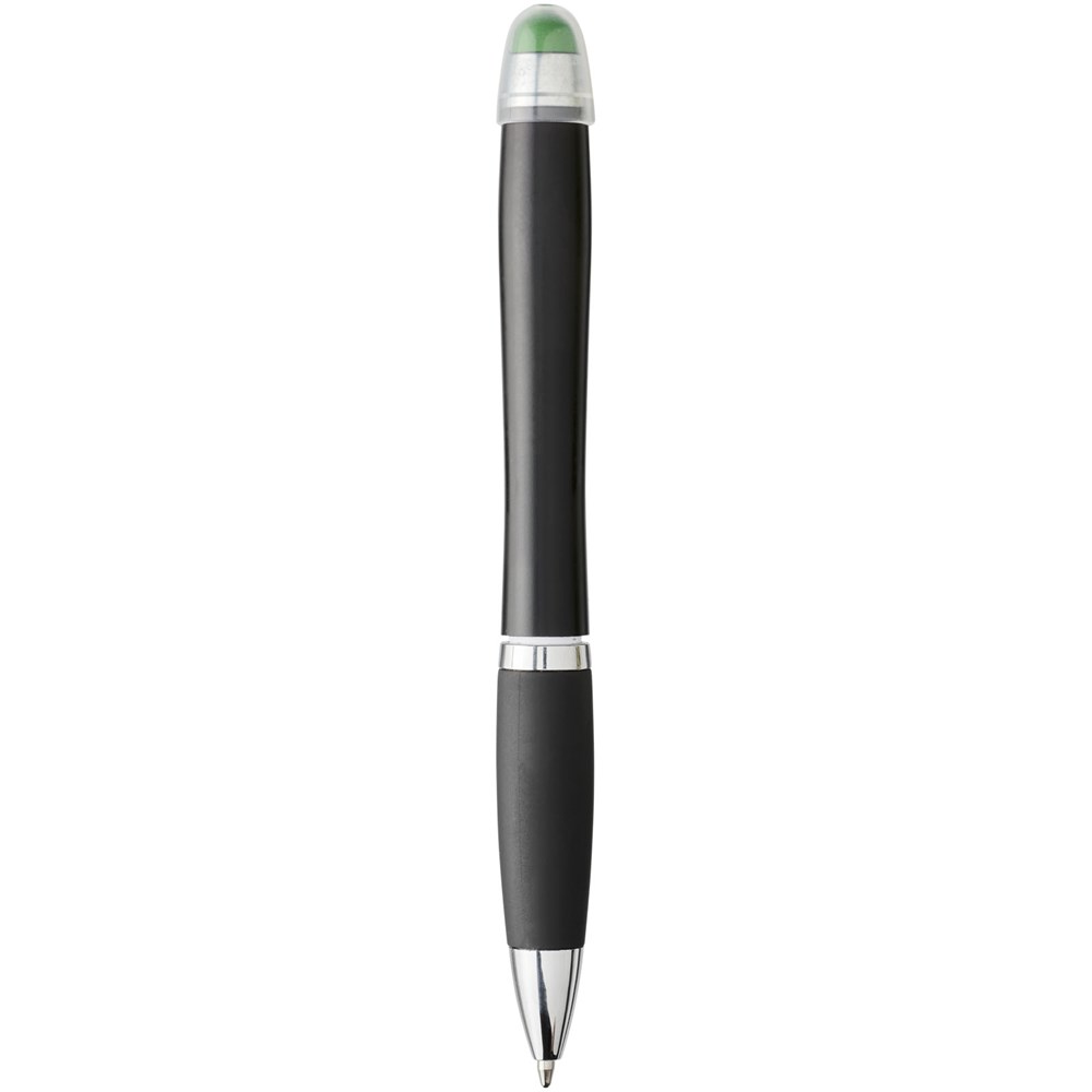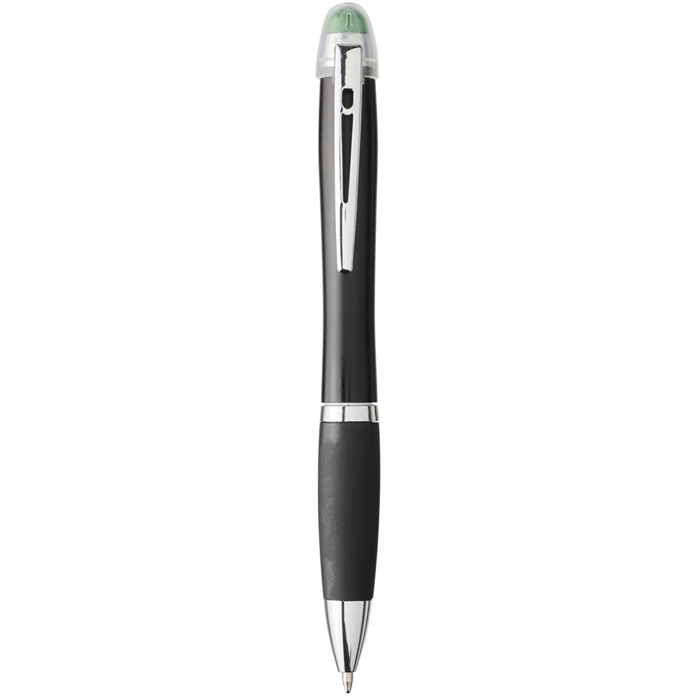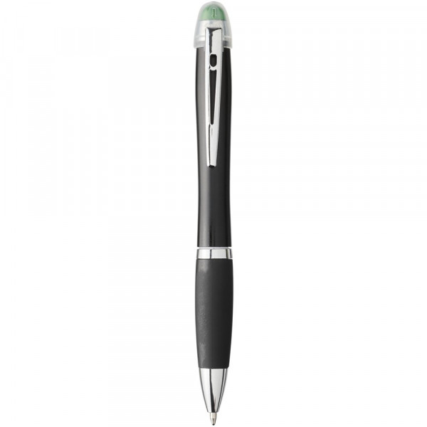 Matzwarte lichtgevende balpen met draaimechanisme, gekleurde stylus, rubberen zwarte handgreep en metalen clip. Decoratiegebied speciaal ontworpen voor lasergravure. Het logo en/of merk zal oplichten in dezelfde kleur als de stylus. Batterijen inbegrepen.