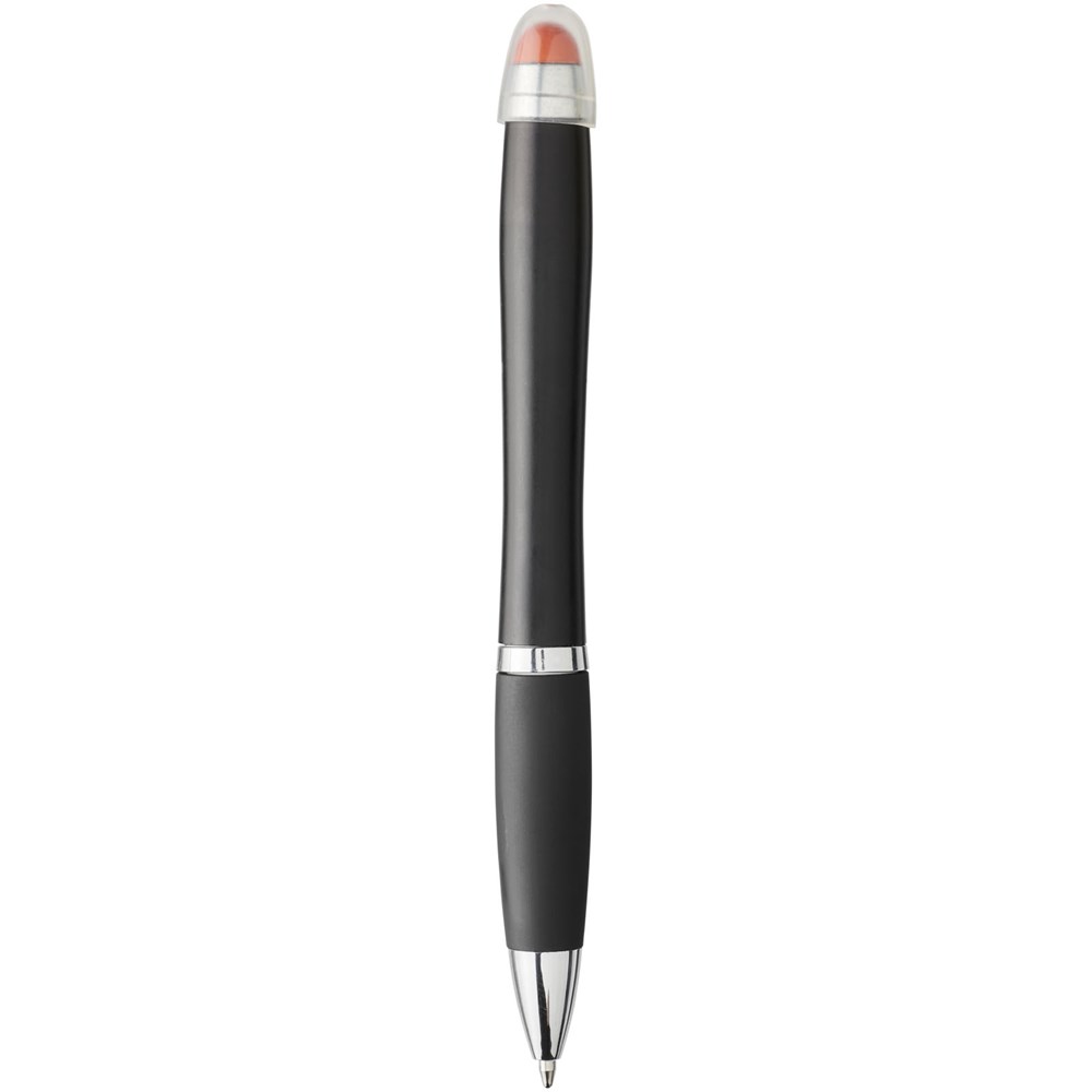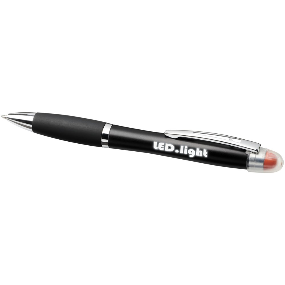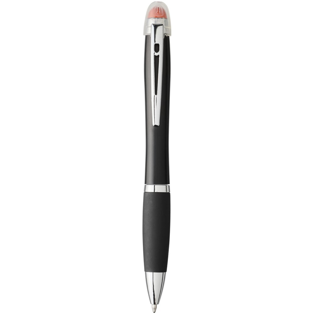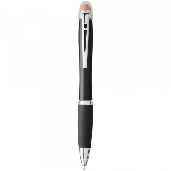 Matzwarte lichtgevende balpen met draaimechanisme, gekleurde stylus, rubberen zwarte handgreep en metalen clip. Decoratiegebied speciaal ontworpen voor lasergravure. Het logo en/of merk zal oplichten in dezelfde kleur als de stylus. Batterijen inbegrepen.