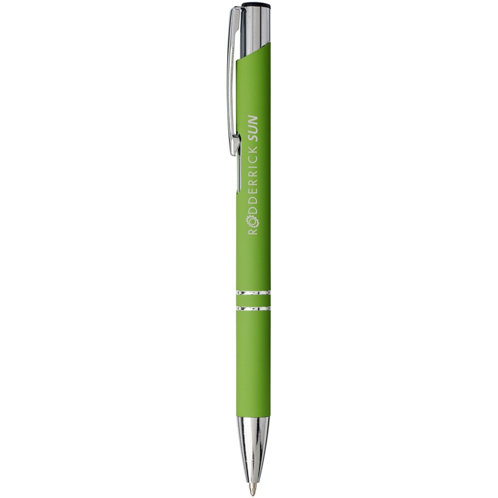 De rubberen coating geeft de pen een zachte touch, en zodra de zilveren onderlaag van de pen met een laser gegraveerd is, wordt de zilveren onderlaag van de pen zichtbaar. Balpen met klikmechanisme met zwarte rubberen coating en verchroomde afwerking en zwarte ABS bovenkant. Het uitgebreide en populaire Moneta-assortiment is verkrijgbaar in vele verschillende stijlen en afwerkingen.