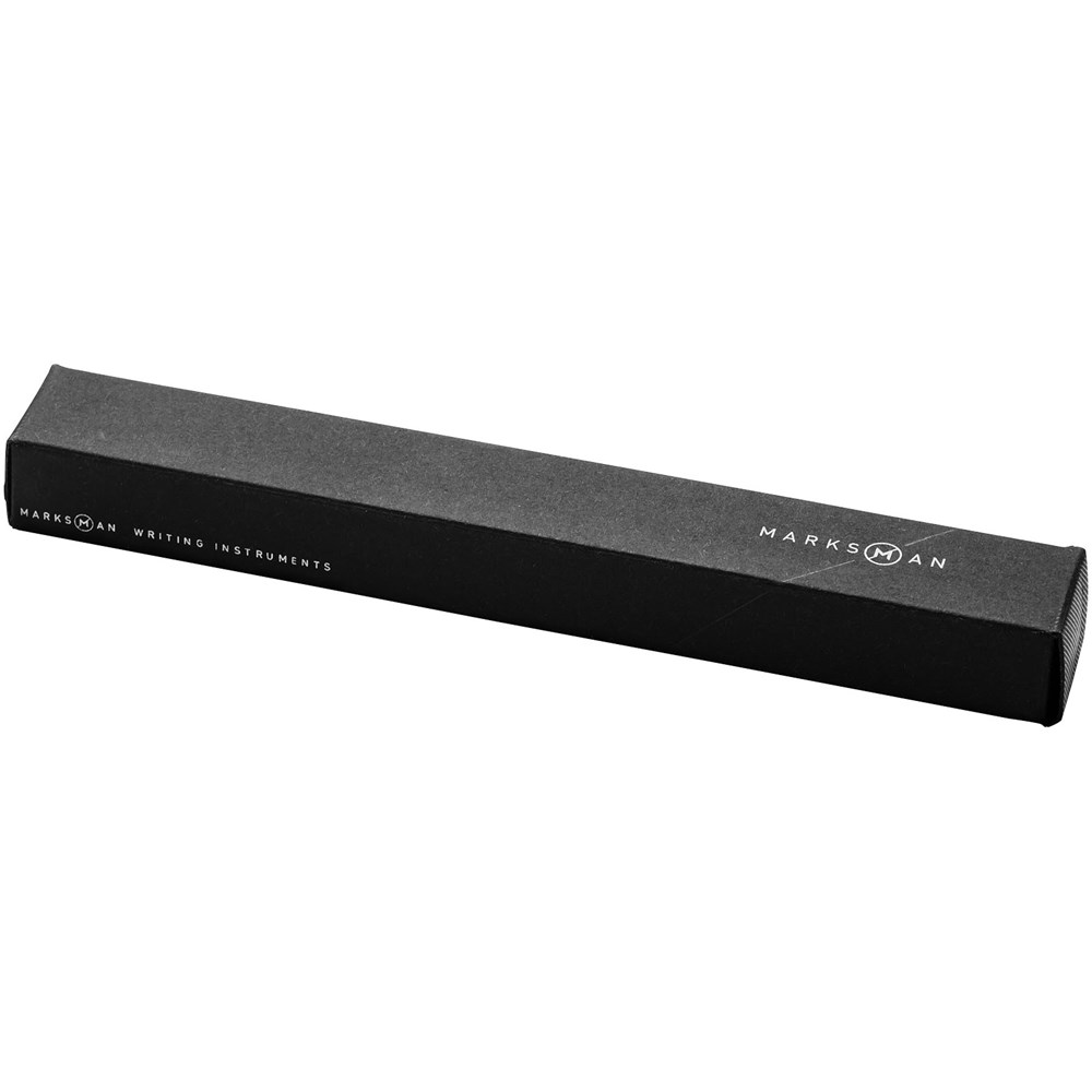 Zo kan het dus ook. De strakke lijnen van deze pen worden nergens onderbroken, ook niet door de clip die uit het materiaal van de schacht is gesneden. Exclusief ontworpen Marksman balpen met draaimechanisme. Geleverd inclusief Zwitserse vulling Zwartschrijvend van in een kartonnen Marksman geschenkverpakking.